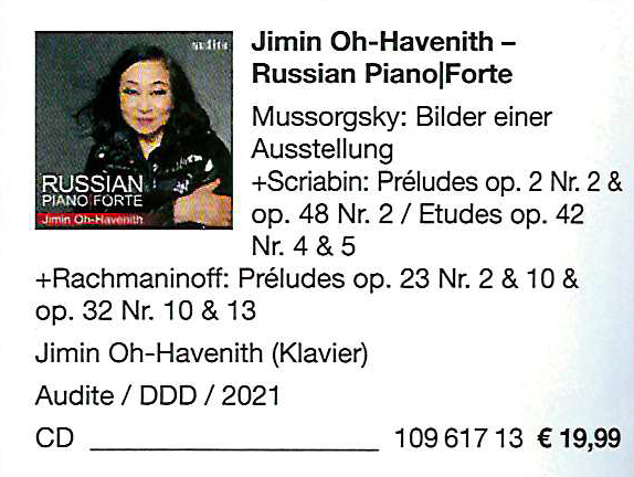 South Korean pianist Jimin Oh-Havenith’s fourth CD for audite is devoted to Russian music.