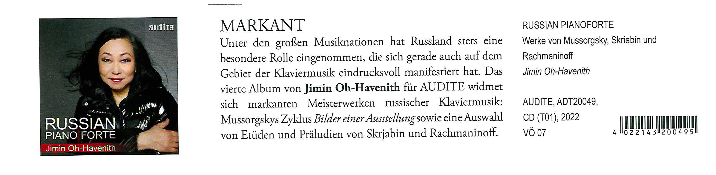 Jimin Oh-Haveniths vierte CD für audite widmet sich mit Werken Mussorgskys, Skrjabins und Rachmaninoffs drei der berühmtesten russischen Komponisten des 19. und (frühen) 20. Jahrhunderts. Lange vor Putins Ukraine-Krieg geplant, ist die Veröffentlichung nun Fanal für die oft beschädigte Freiheit der Kunst.