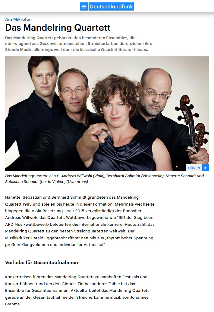 Im Mandelring Quartett spielen die drei Geschwister Sebastian, Nanette und Bernhard Schmidt zusammen mit dem Bratscher Andreas Willwohl. Der frühere Solobratscher des Rundfunk Sinfonieorchesters Berlin ersetzt seit 2015 Roland Glassl, der dem Ensemble zuvor mehr als 15 Jahre angehört hat und für diese höchst gelungene Aufnahme zu fünft noch einmal mit von der Partie ist. In dieser speziellen Konstellation aus Familienmitgliedern und Freunden verwirklicht sich erneut ein über mehr als drei Jahrzehnte entwickeltes Klangideal, das seinesgleichen sucht.