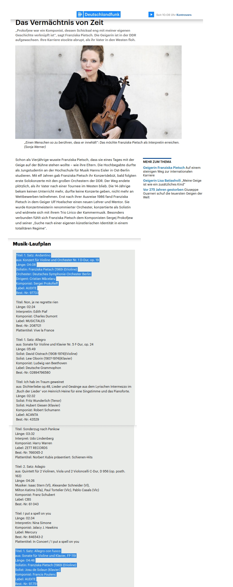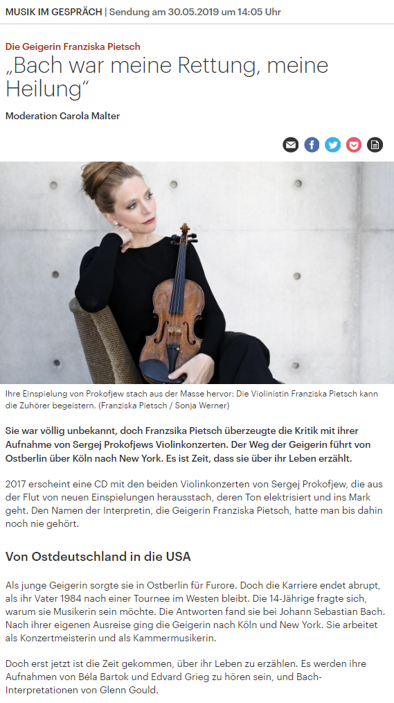 Franziska Pietsch spielt die Konzerte ohne süsslichen, sondern mit bewusst rauem Ton, der für eine enorme Expressivität sorgt. Zweifellos kommt darin auch die besondere Lebenserfahrung der Geigerin zum Ausdruck. Denn mehr als rau sind manche Einzelheiten in der Biografie der 1969 in Halle/Saale geborenen Solistin: als Wunderkind in jungen Jahren auf den Bühnen der DDR erfolgreich, wird Pietsch nach der sogenannten „Republikflucht“ ihres Vaters 1984 vom System fallengelassen, verliert ihren herausgehobenen Status und büßt auch den Studienplatz als hochbegabte Jungstudentin ein. Zwei Jahre später kann sie mit ihrer Mutter in den Westen ausreisen und den Neuanfang beginnen. Über viele Stationen hat sich Franziska Pietsch bis heute einen verdienten Spitzenplatz unter den deutschen Geigerinnen erarbeitet.