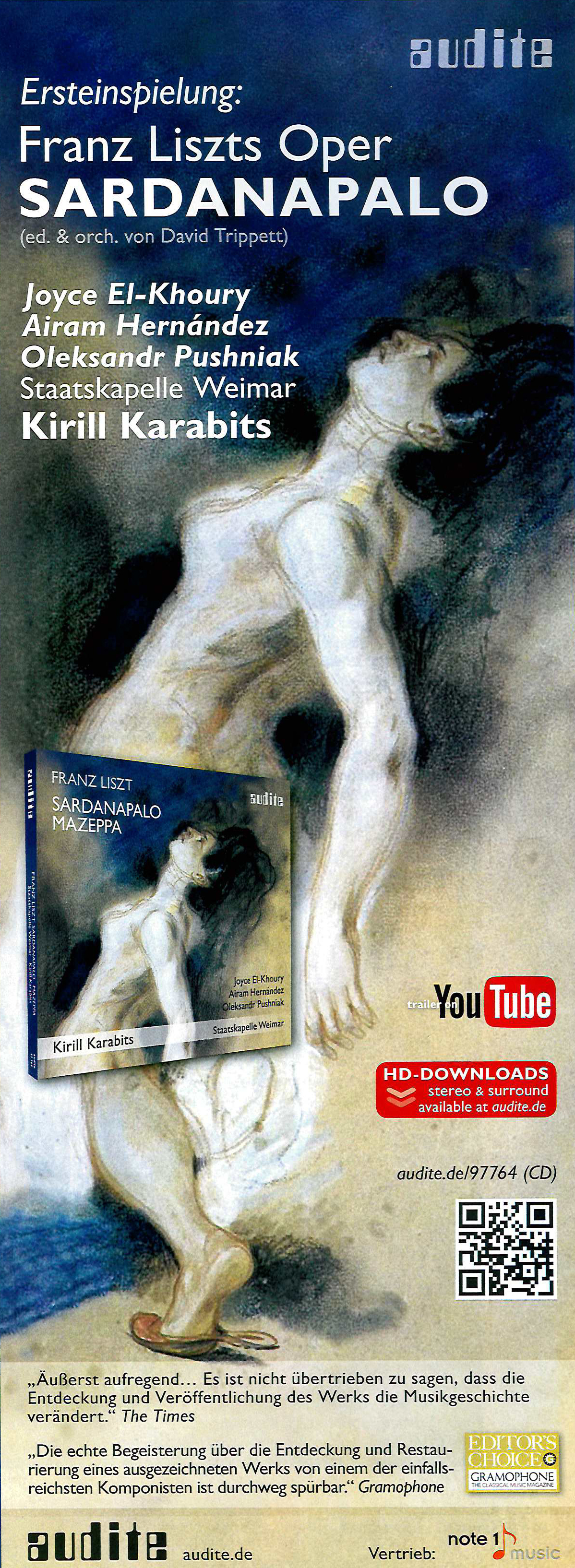Der assyrische König Sardanapalo, der als Hedonist Wein und Konkubinen den Staatsgeschäften vorzieht, und der ukrainische Volksheld Iwan Mazeppa, der nach Leid und Erniedrigung ruhmvoll stirbt: konträrer könnte man sich zwei Protagonisten wohl kaum vorstellen. Die literarisch-dramatischen Vorlagen von Lord Byron und Victor Hugo dienten Franz Liszt als Inspirationsquelle, wobei die Oper Sardanapalo nach Byron leider Fragment blieb. Die zeitgleich in Weimar entstandenen Werke repräsentieren die Ideen des Komponisten im Ringen um eine Vereinigung von Literatur und Musik. Auf der einen Seite die Modernisierung der italienischen Oper, auf der anderen die Weiterentwicklung der Sinfonik. Das Manuskript zu Sardanapalo umfasst lediglich den ersten Akt, weshalb das Material 170 Jahre lang im Weimarer Goethe- und Schiller-Archiv schlummerte. Erst 2017 wurde die Niederschrift von David Trippett an der University of Cambridge entziffert, editiert und orchestriert. „Die erhalten gebliebene Musik ist atemberaubend – eine einzigartige Mischung aus italienisch beeinflusstem Gefühlsüberschwang, kühnen harmonischen Wendungen und Seitenwegen“, beschreibt Trippett die Komposition. „Es gibt nichts Vergleichbares in der Opernwelt. Das Werk ist durchflutet von Liszts charakteristischem Stil und birgt zugleich Elemente von Bellini und Meyerbeer, in denen immer wieder auch Wagner zu erkennen ist.“ Kirill Karabits hat das Fragment mit der Staatskapelle Weimar für AUDITE erstmals eingespielt, mit dem Orchester der Stadt, für welche die Oper einst gedacht war. Das Label setzt damit die verdienstvolle und vielbeachtete Veröffentlichungsreihe von Werken der großen Komponisten und Weimarer Kapellmeister fort.