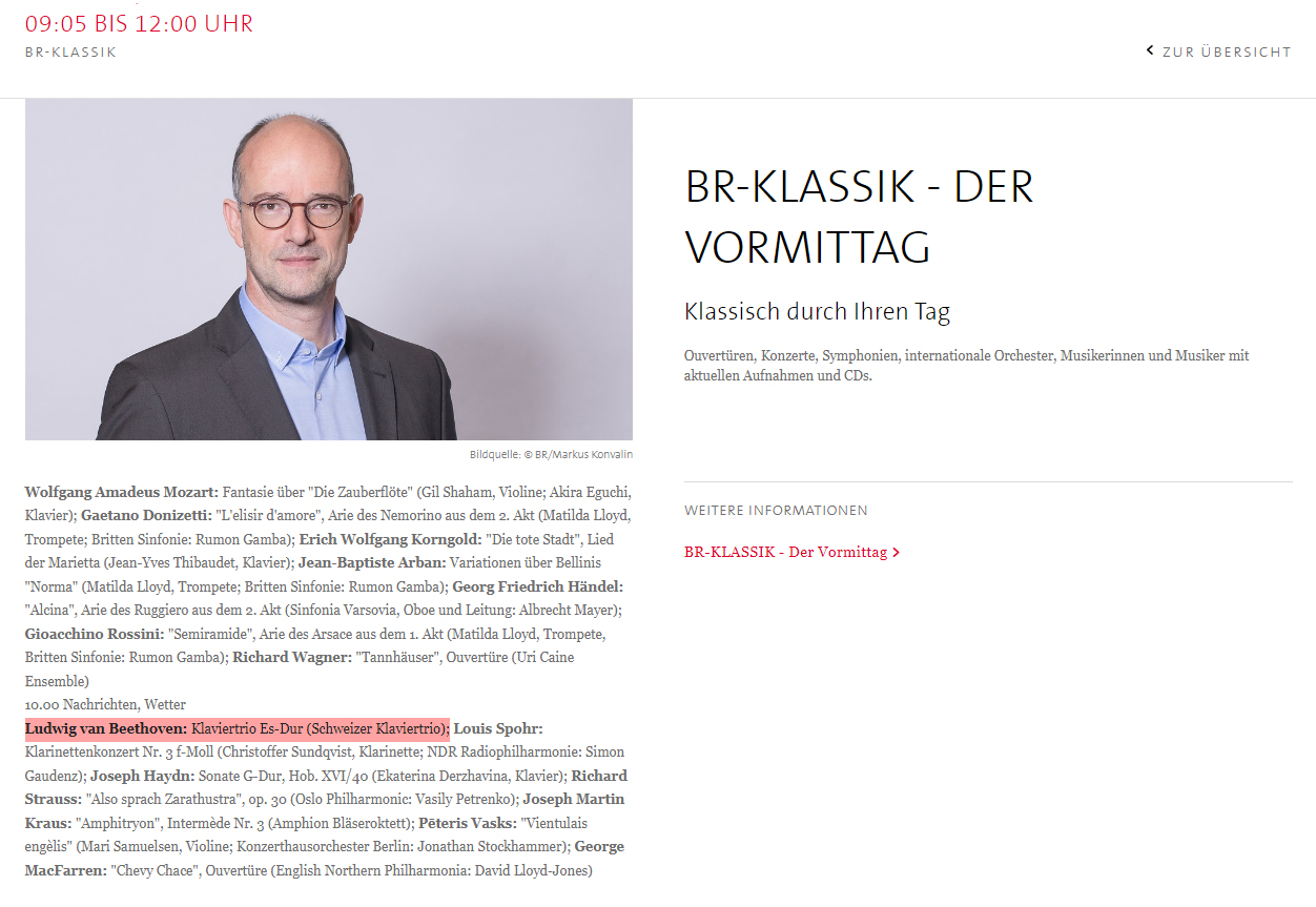 Hallo und willkommen zur zweiten Stunde der Klassikwelt. Hand auf´s Herz: Zu Beginn dieses Jahres hatten viele Musikfreunde fast ein bisschen Angst, dass in diesem Jahr ein Komponist alles dominieren würde: Ludwig van Beethoven. Weltweit waren Tausende von Konzerten zu seinem 250. Geburtstag geplant. Dann kam Corona und alles war anders. Livekonzerte wurde abgesagt, und Streaming war das neue Zauberwort. Vom Beethoven-Jahr ist also nicht viel übrig geblieben, aber die fatale Situation hat auch unerwartete Früchte hervorgebracht. So hatte das Schweizer Klaviertrio eigentlich mit Folge 5 seine Gesamteinspielung sämtlicher Trios von Beethoven abgeschlossen. Durch die Corona-Krise hatte das fabelhafte Ensemble aus der Schweiz plötzlich keine Konzerte mehr. Martin Lucas Staub, der Pianist des Trios, hatte plötzlich ganz viel Zeit und entdeckte in seinen Noten zu Hause eine Bearbeitung von Beethovens 2. Sinfonie für Klaviertrio. Das Trio hat diese ungewöhnliche Version von Beethovens Sinfonie dann auch im Studio aufgenommen. Herausgekommen ist dabei eine echte Rarität zum Beethoven-Jahr. Die bekannte Musik in neuer Verpackung klingt erfrischend anders, und das Schweizer Klaviertrio wird hier zum farbigen „Mini-Orchester“. Hier kommen die ersten beiden Sätze aus Beethovens zweiter Sinfonie in D-Dur in der Fassung für Klaviertrio…