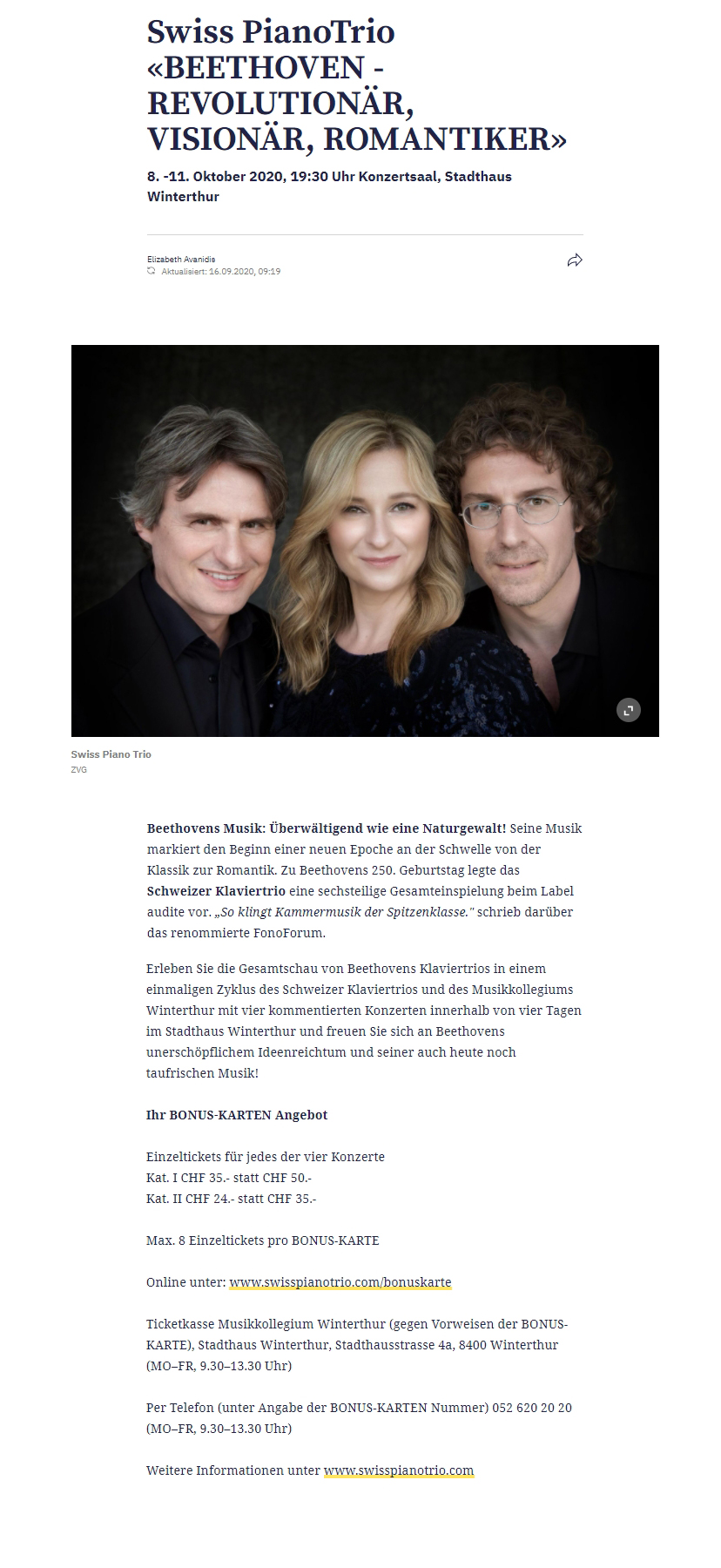 www.pizzicato.lu | 12/11/2020 | Remy Franck & Guy Engels | 12. November 2020 | Quelle: https://www.pizz... Swiss Piano Trio beendet erfolgreichen Beethoven-Zyklus