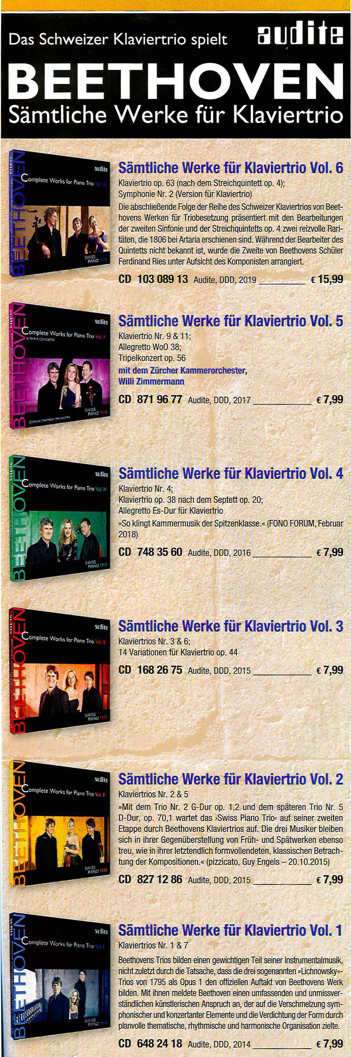 "Mit dieser 6. CD beendet das Swiss Piano Trio eine Beethoven-Integrale, die Referenzcharakter haben wird." (Pizzicato)