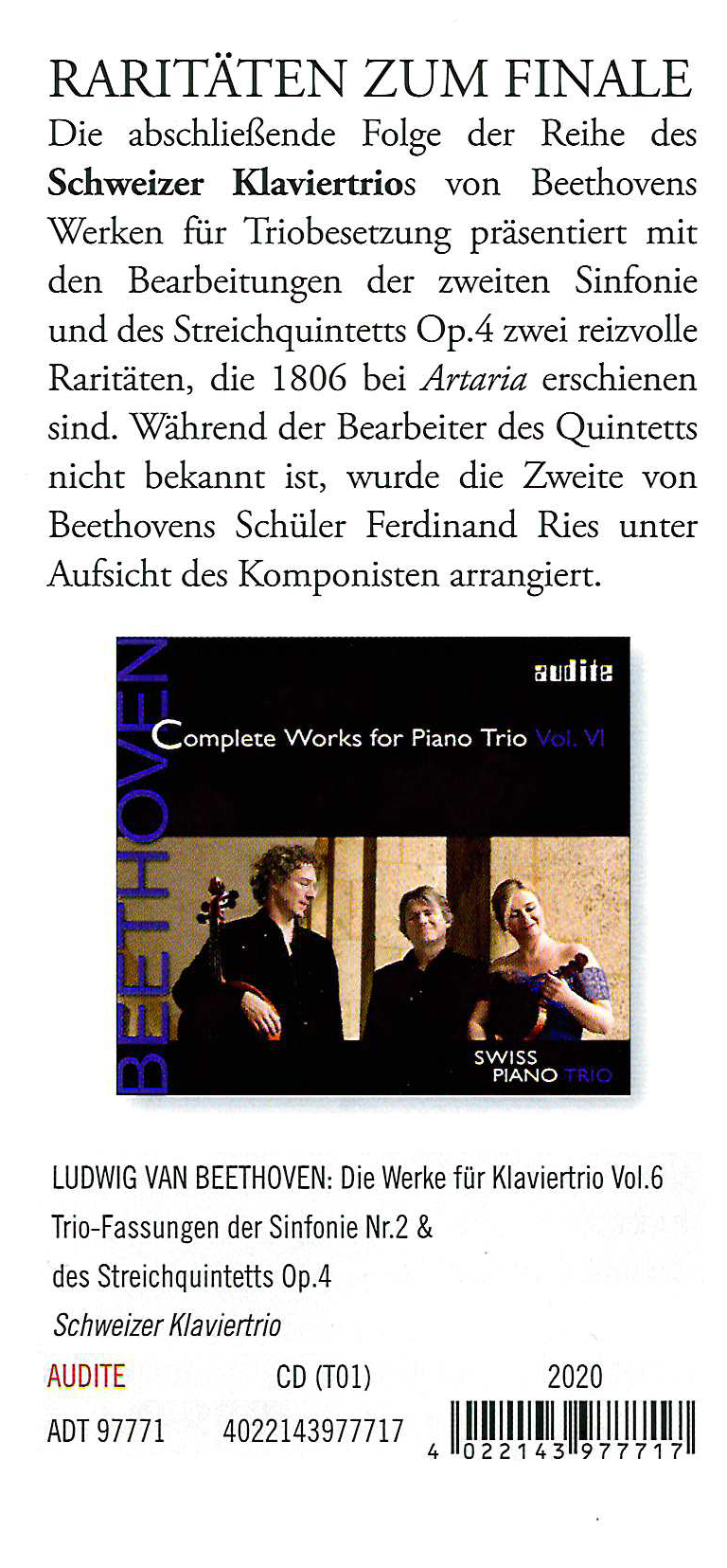 Die sechste und letzte Veröffentlichung des Schweizer Klaviertrios mit Werken für Klaviertriobesetzung Ludwig van Beethovens präsentiert mit den Bearbeitungen zweier früher Meisterwerke echte Raritäten: die Trio-Fassungen von Beethovens 2. Symphonie sowie seines Streichquintetts op. 4, das er als eigene Umarbeitung seines Oktetts op. 103 komponierte. Bei der vorliegenden Trio-Fassung des Streichquintetts handelt es sich also um eine doppelte Bearbeitung des Oktetts.