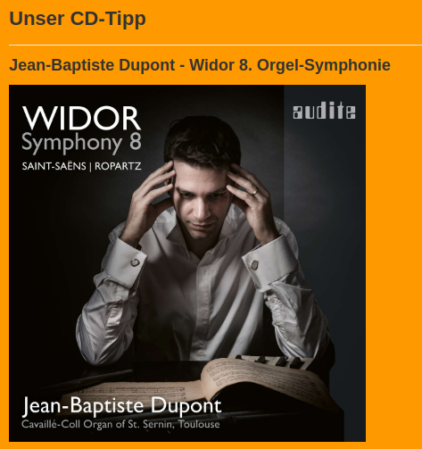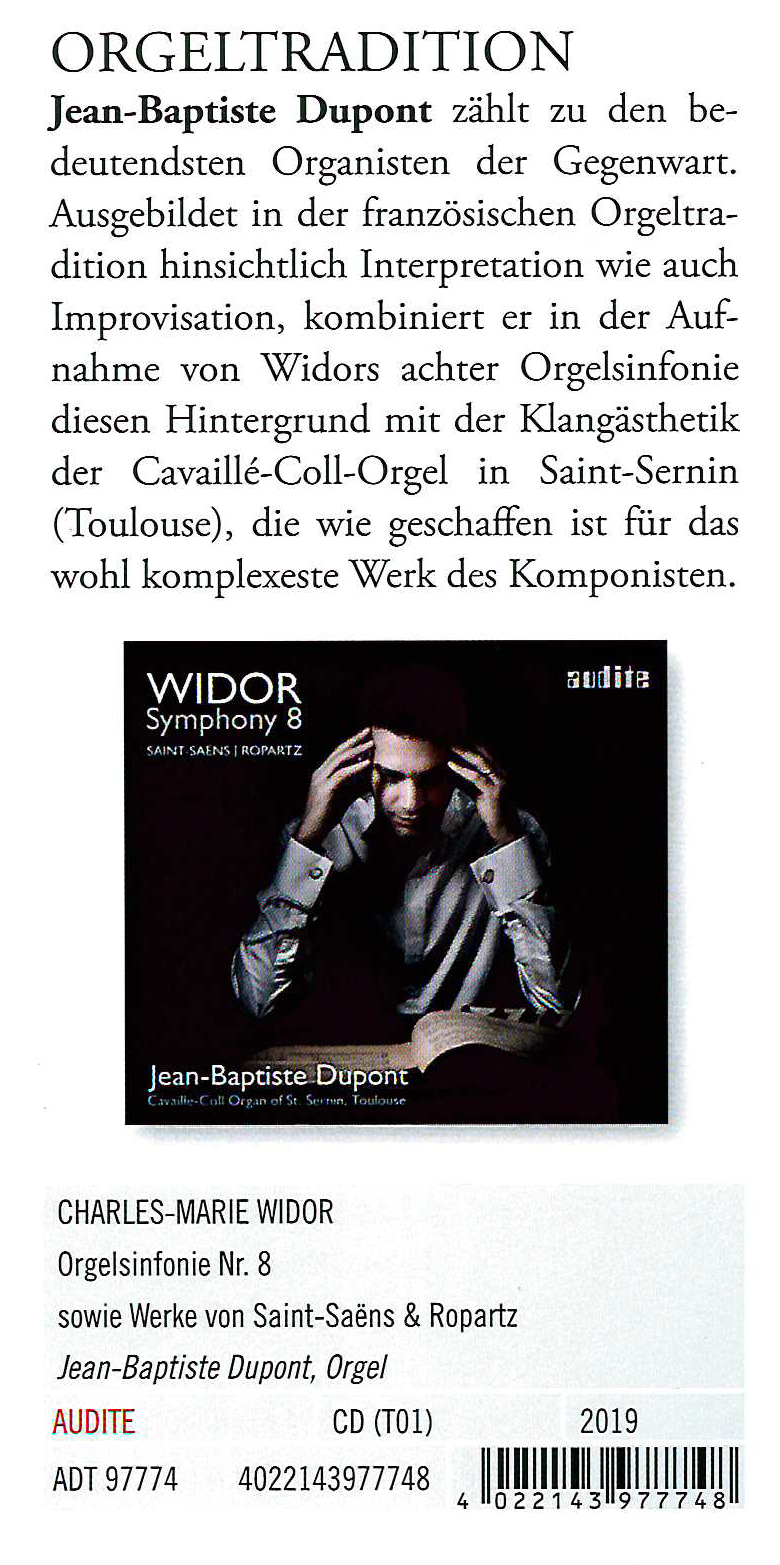 Orgelsymphonien sind vielleicht nicht jedermanns Sache. Bei Jean-Baptiste Dupont ist man in guten Händen, sich auf differenzierte und einfühlsame Weise auf dieses spannende Repertoire einzulassen.