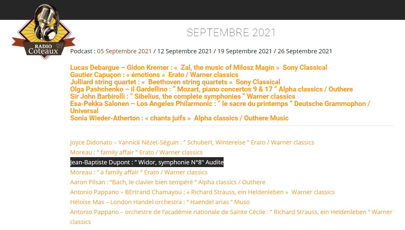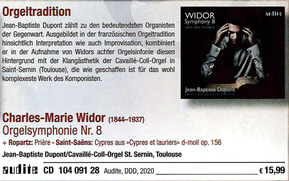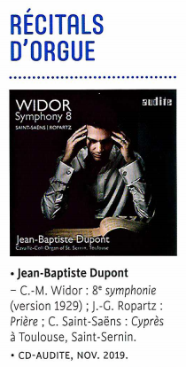 Ausgebildet in der französischen Orgeltradition sowohl in Interpretation als auch Improvisation vereint seine neue Aufnahme von Widors 8. Orgel-Symphonie diese Tradition mit der Klangästhetik einer Cavaillé-Coll-Orgel: Das Instrument in Saint-Sernin (Toulouse) ist wie gemacht für das komplexeste Werk Widors, der bekannte, dass er ohne die Hörerfahrung der Instrumente von Cavaillé-Coll keine Orgelmusik geschrieben hätte.