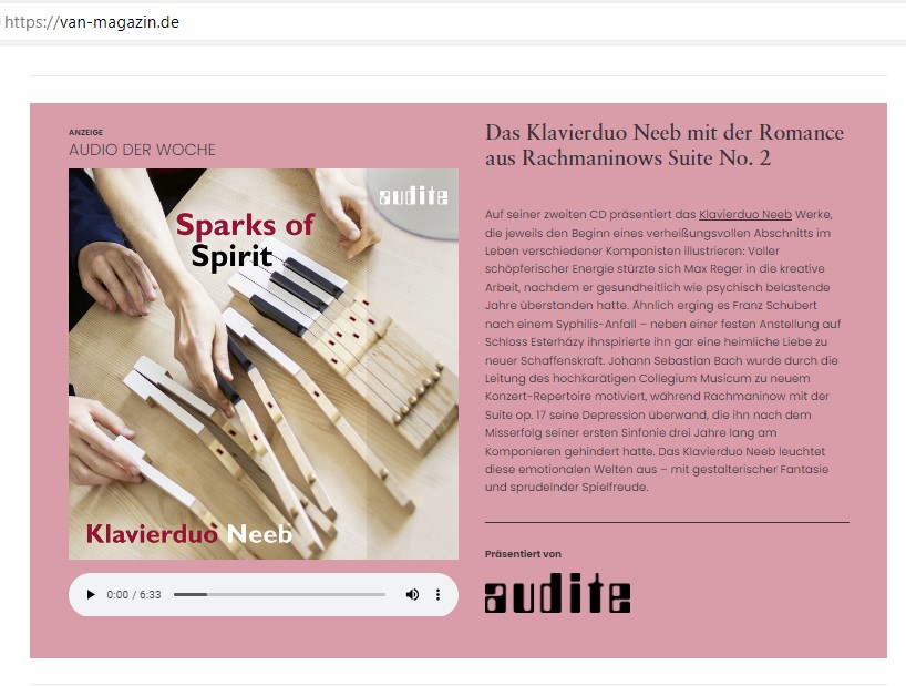 Wenig später hat das Klavierduo Neeb weitere Funken ihres gemeinsamen Schaffens auf Tonträger gebannt: "Sparks of Spirit". Sophie und Vincent Neeb widmen sich darauf Werken, die im Leben der Komponisten Schubert, Bach, Reger und Rachmaninoff jeweils den Beginn eines neuen Lebensabschnitts markierten - ähnlich wie diese beiden exzellenten Tonträger wohl eine neue Ära bei den Neebs einläuten.