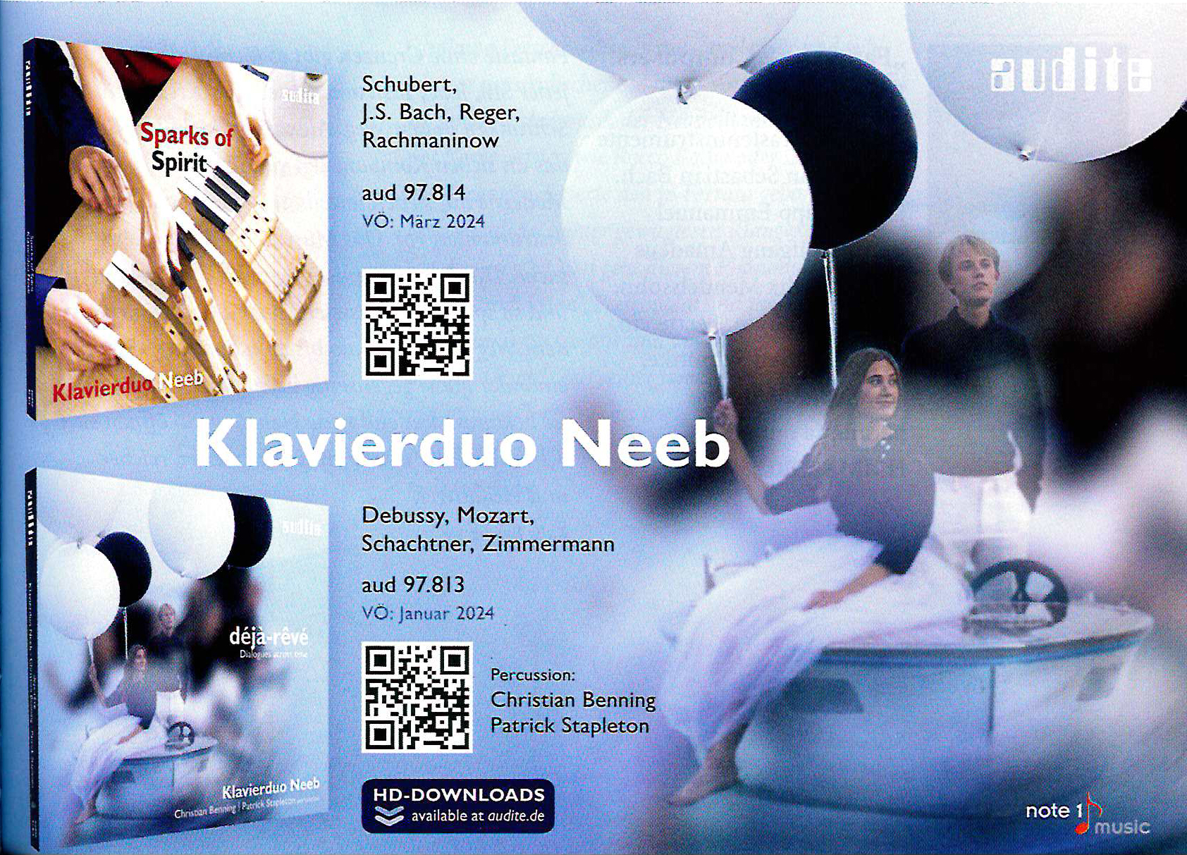 Sophie (geb. 2000) und Vincent Neeb (geb. 1998) sind Geschwister. Schon in frühen Jugendjahren haben sie das gemeinsame Musizieren am Klavier für sich entdeckt. Eine Entdeckung, die auch der Außenwelt nicht verborgen blieb: zahlreiche Wettbewerbspreise und Stipendien wurde dem Klavierduo seither zuteil. Beim Label audite veröffentlicht das Duo nun gleich zwei Alben innerhalb kurzer Zeit.