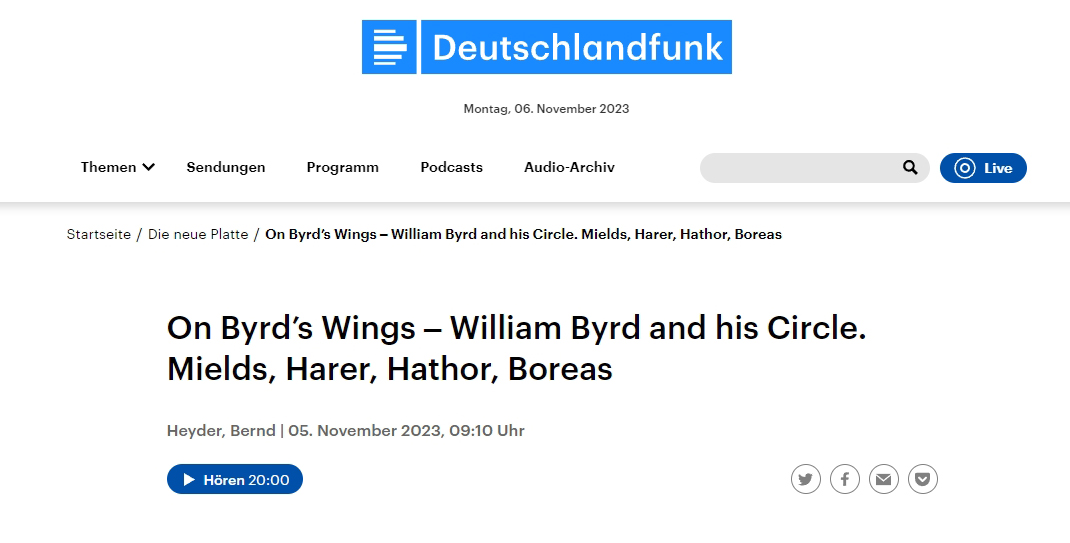 „On Byrds Wings – William Byrd and his Circle“ heißt diese schöne und facettenreiche neue CD mit Musik aus dem England um 1600. Bei einigen Stücken sind die beiden Sopranistinnen Dorothee Mields und Magdalene Harer beteiligt. Beide zählen zu den herausragenden Sängerinnen in der Alte Musik Szene. Und es ist wirklich ein Fest, wie sie gemeinsam Musik machen mit diesen großartigen Instrumentalisten des Hathor und des Boreas Consorts. Die CD ist beim Label audite herausgekommen, wie immer bei diesem Label sehr gut aufgenommen und das Booklet ist informativ und sorgfältig gestaltet. Zwei Weihnachtsstücke von Byrd und Gibbons sind auch dabei, für mich echte Entdeckungen, die senden wir später mal in der Weihnachtszeit.