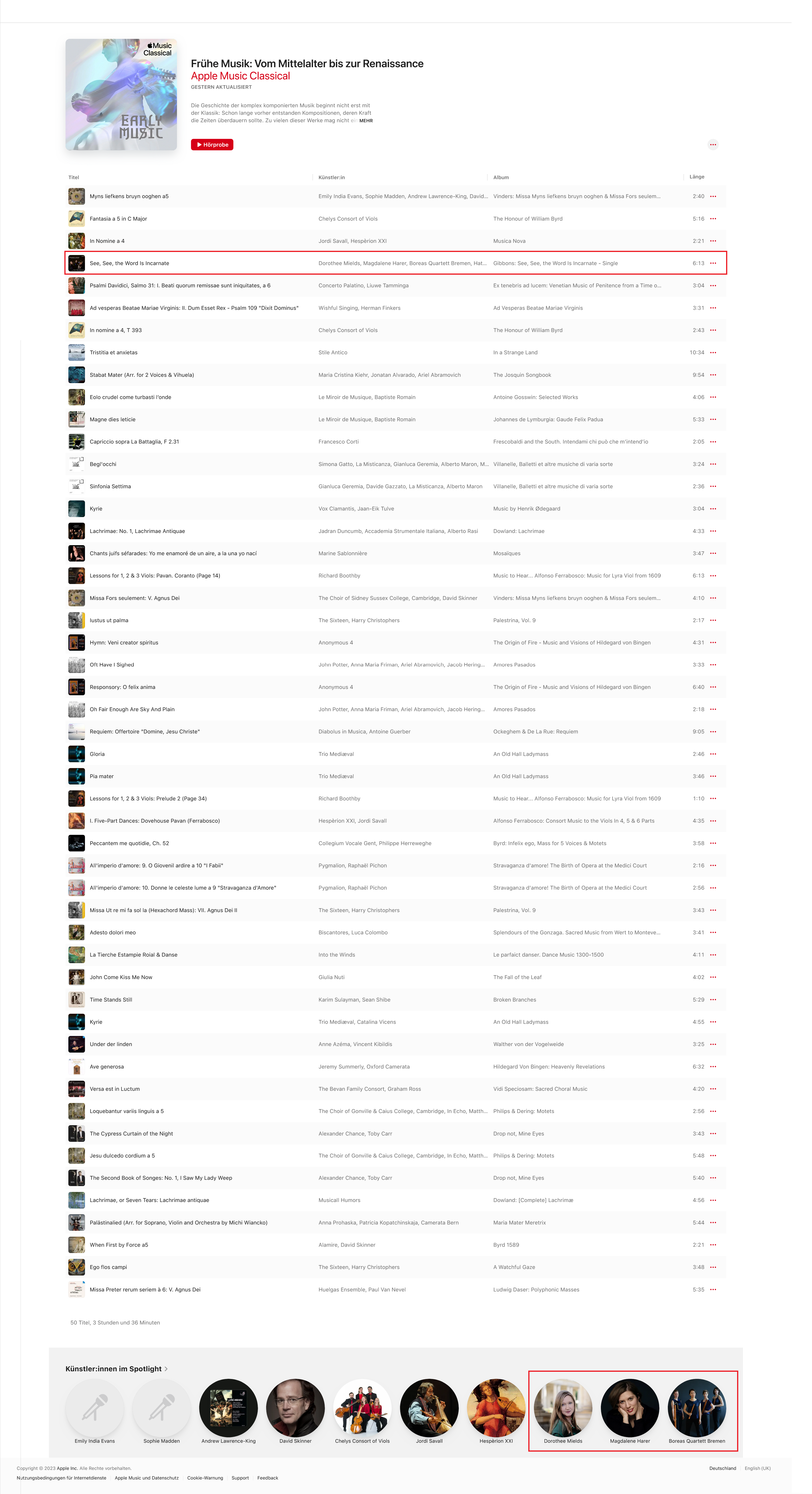 La música es interpretada por el Boreas Quartett Bremen, una agrupación especializada en la música de la "Consorte", un conjunto musical popularizado en la Inglaterra de los siglos 16 y 17. También es llamado así el estilo musical que se representaba por dichos conjuntos. También interpreta en el álbum el Hathor consort y las voces están a cargo de las Soprano Dorothee Mields y Magdalene Harer.