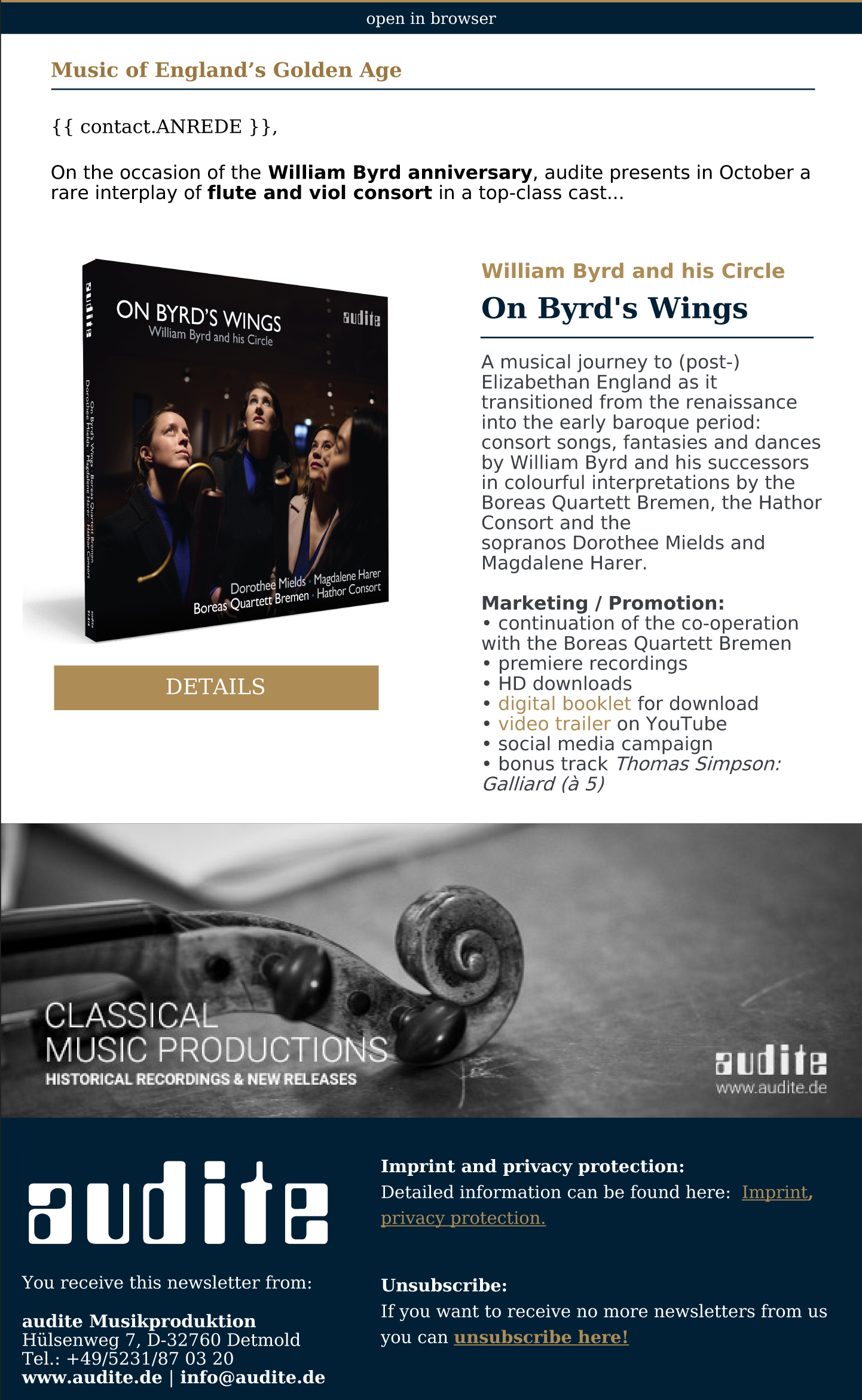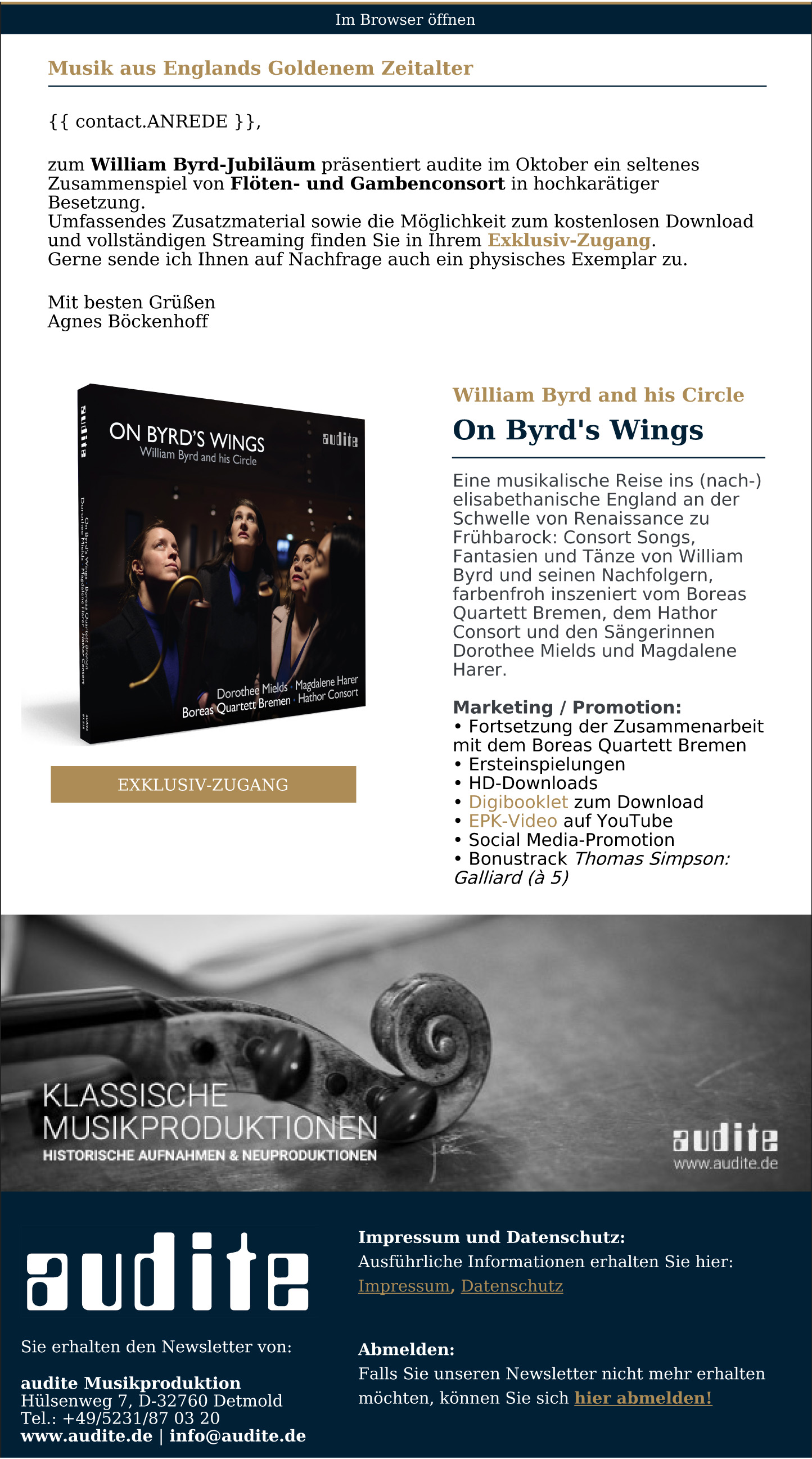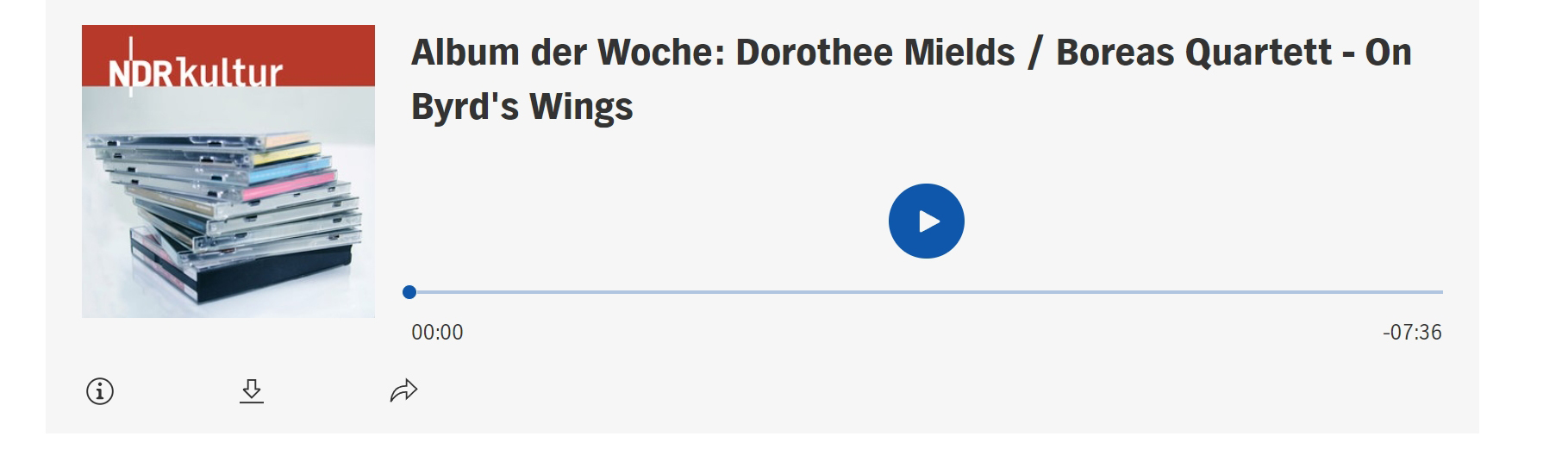 „On Byrds Wings – William Byrd and his Circle“ heißt diese schöne und facettenreiche neue CD mit Musik aus dem England um 1600. Bei einigen Stücken sind die beiden Sopranistinnen Dorothee Mields und Magdalene Harer beteiligt. Beide zählen zu den herausragenden Sängerinnen in der Alte Musik Szene. Und es ist wirklich ein Fest, wie sie gemeinsam Musik machen mit diesen großartigen Instrumentalisten des Hathor und des Boreas Consorts. Die CD ist beim Label audite herausgekommen, wie immer bei diesem Label sehr gut aufgenommen und das Booklet ist informativ und sorgfältig gestaltet. Zwei Weihnachtsstücke von Byrd und Gibbons sind auch dabei, für mich echte Entdeckungen, die senden wir später mal in der Weihnachtszeit.