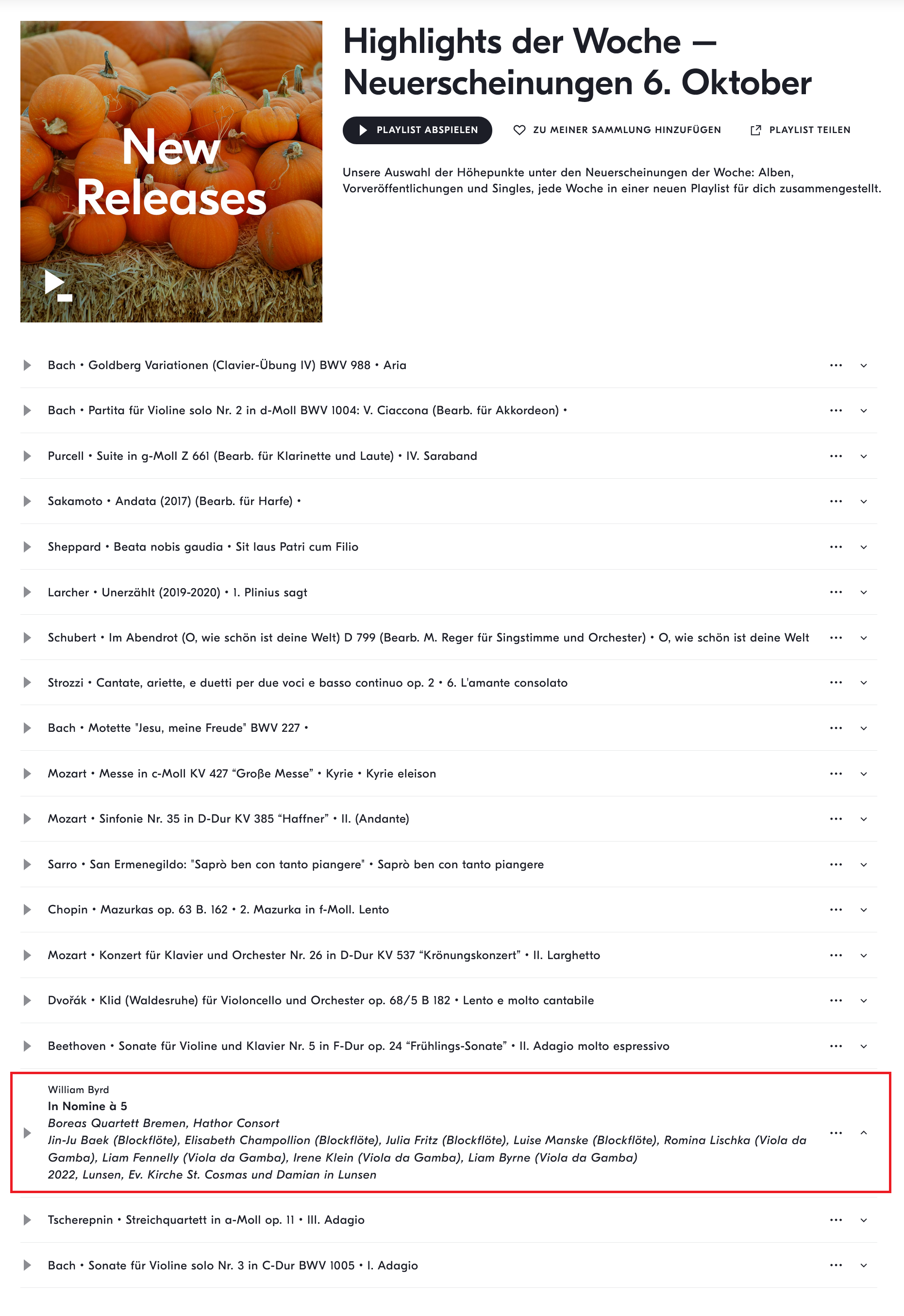 „Have mercy upon me“, ein Bußpsalm von William Byrd, gesungen von Dorothee Mields und Magdalene Harer mit innigem und schlichtem Ausdruck. Ich finde das wunderschön, wie sich diese beiden Stimmen umranken und wie sie sich mit den Instrumenten mischen, den Blockflöten des Boreas Quartett Bremen und dem Hathor Consort mit seinen Gamben und der Laute. Das ist einfach super zusammen geatmet und phrasiert, die Farben sind wunderschön abgestimmt, die Intonation ist so sauber, dass manche Akkorde regelrecht leuchten, aber eben niemals grell, sondern einfach durchsichtig.