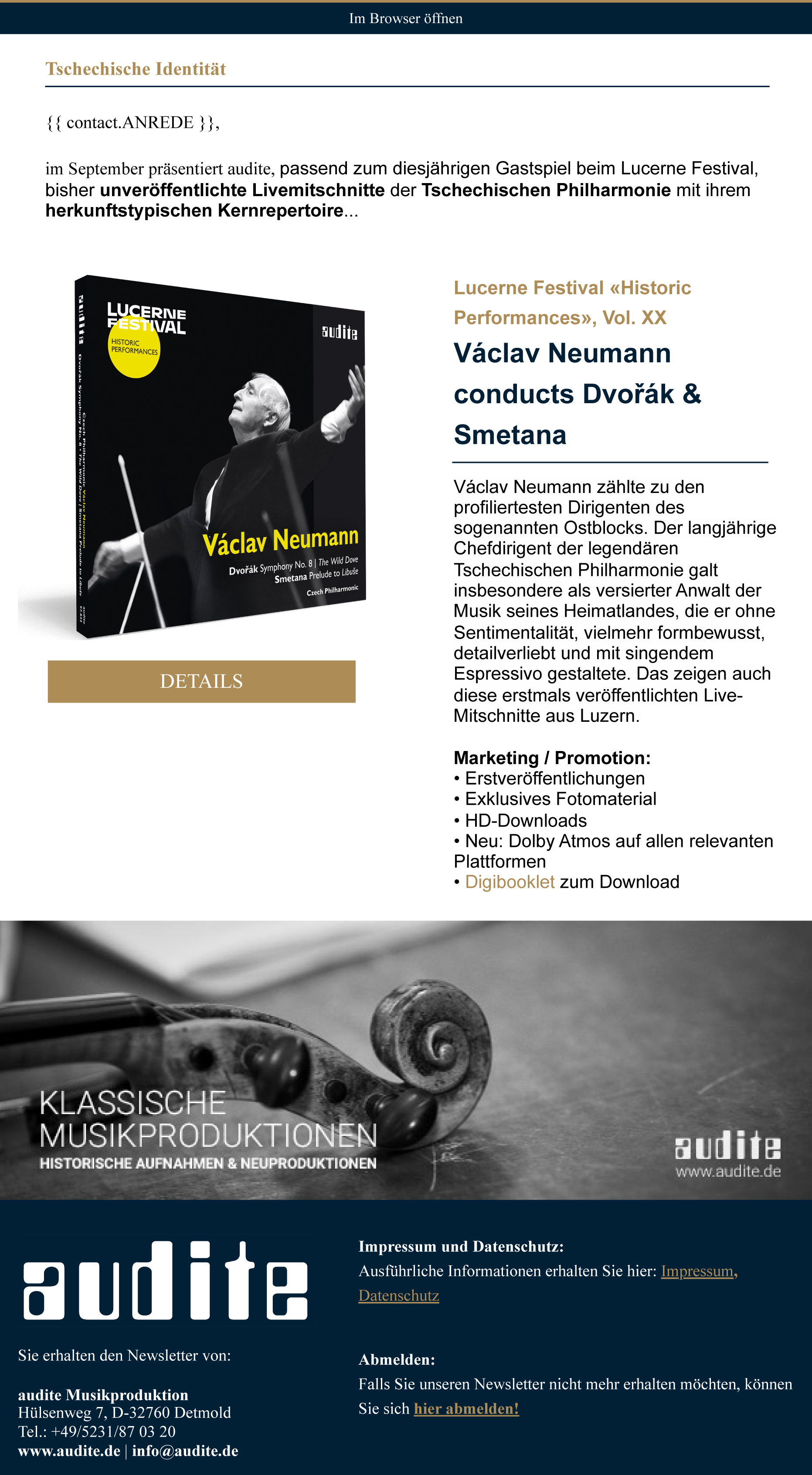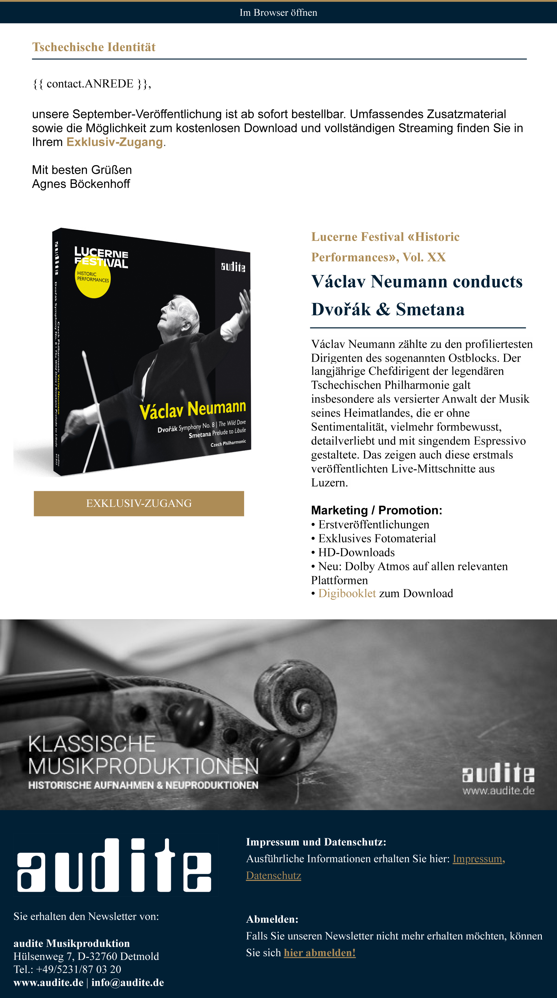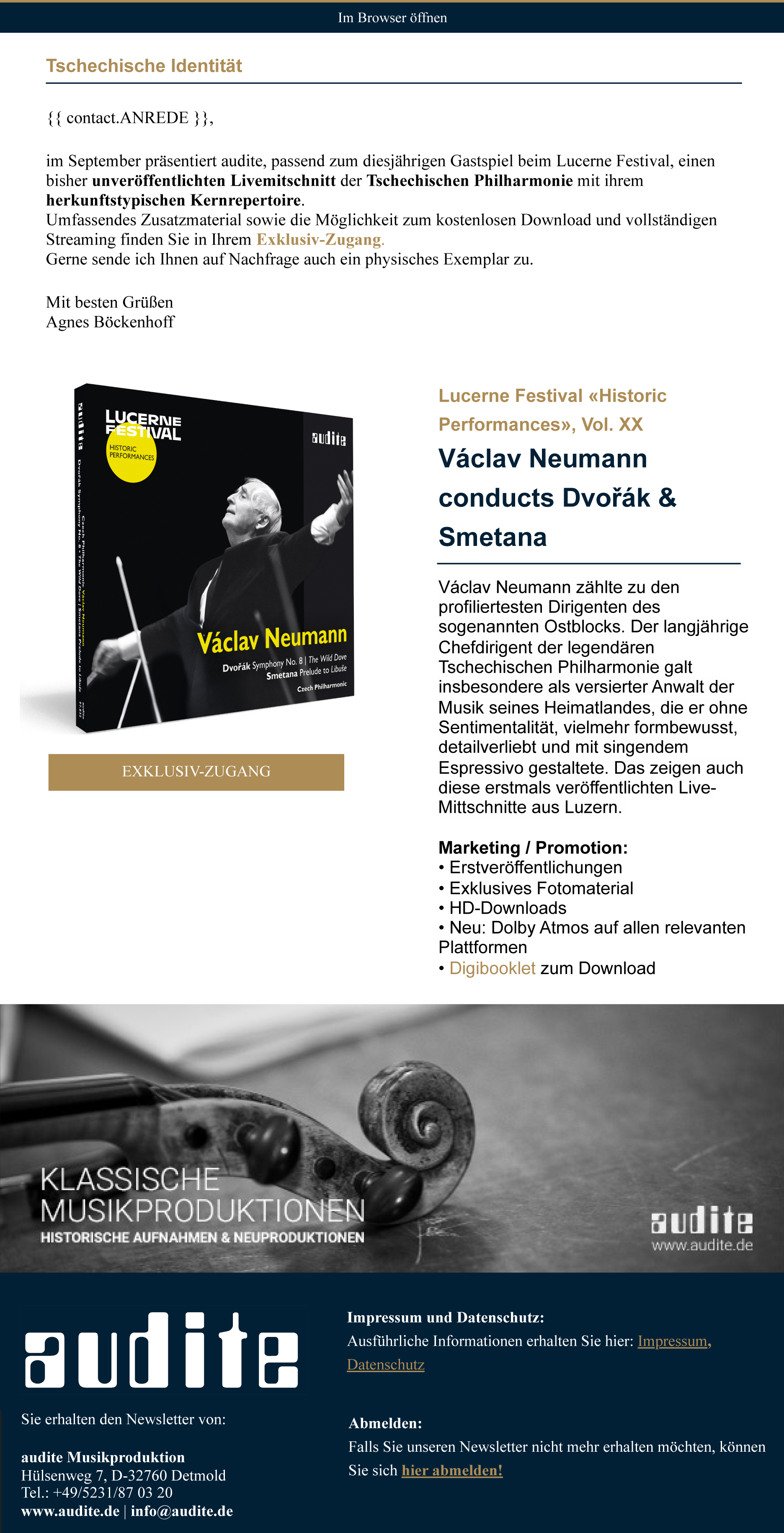 Drei erstmals veröffentliche Live-Mitschnitte aus Luzern erinnern an Václav Neumann, einen der profiliertesten Pultstars des sogenannten Ostblocks. Als langjähriger Chefdirigent der legendären Tschechischen Philharmonie galt Neumann als versierter Anwalt insbesondere der Musik seines Heimatlandes, die er ohne Sentimentalität, vielmehr formbewusst, detailverliebt und mit singendem Espressivo gestaltete.