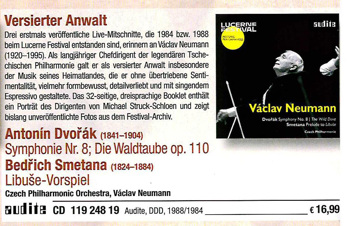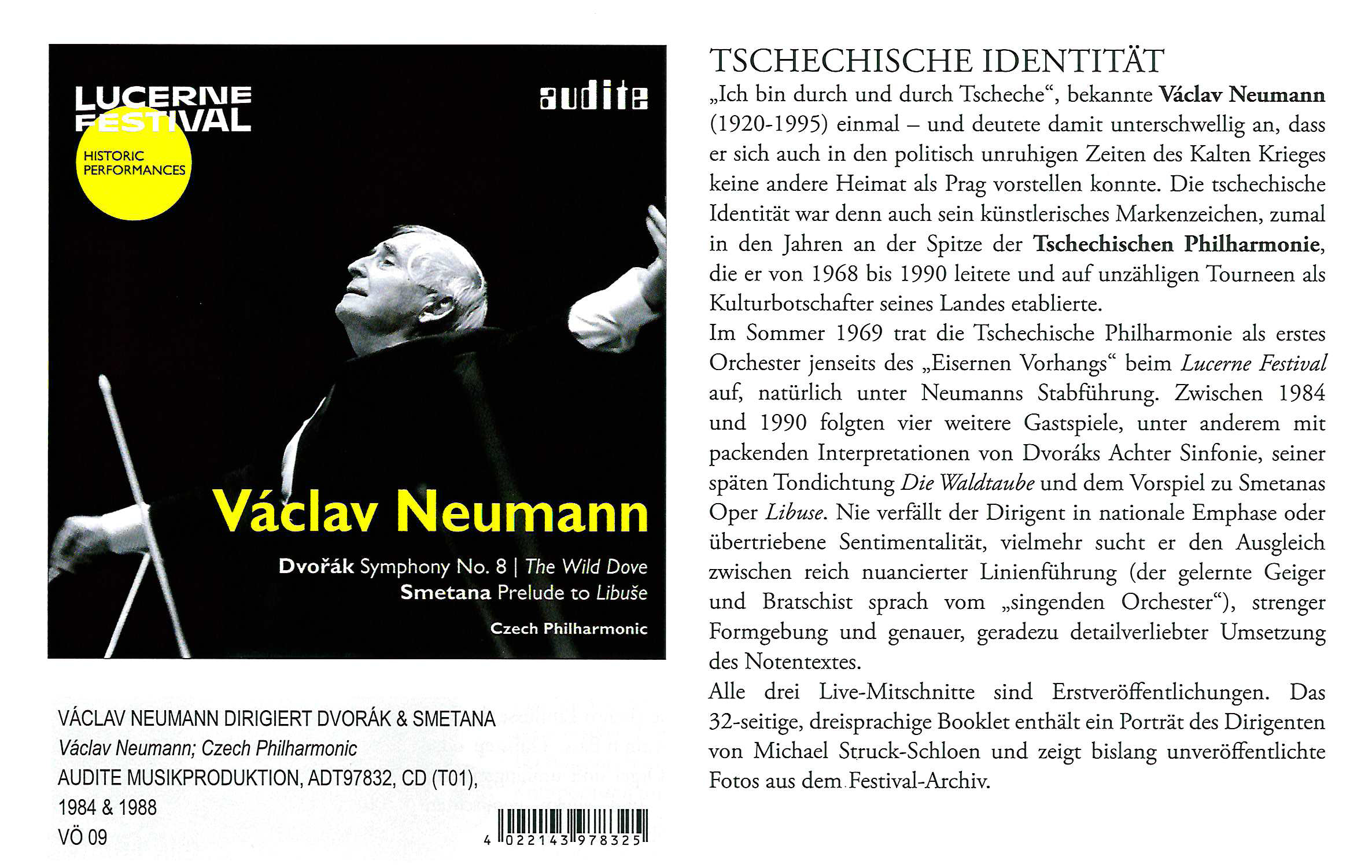 Im Sommer 1969 trat die Tschechische Philharmonie als erstes Orchester jenseits des «Eisernen Vorhangs» bei Lucerne Festival auf - natürlich unter Neumanns Stabführung. Zwischen 1984 und 1990 folgten vier weitere Gastspiele, u. a. mit packenden Interpretationen von Dvořáks Achter Sinfonie, seiner späten Tondichtung Die Waldtaube und dem Vorspiel zu Smetanas Oper Libuše. Nie verfällt Neumann in nationale Emphase, vielmehr sucht er den Ausgleich zwischen reich nuancierter Linienführung - der gelernte Geiger und Bratschist sprach vom «singenden Orchester» -, strenger Formgebung und genauer Umsetzung des Notentextes.
