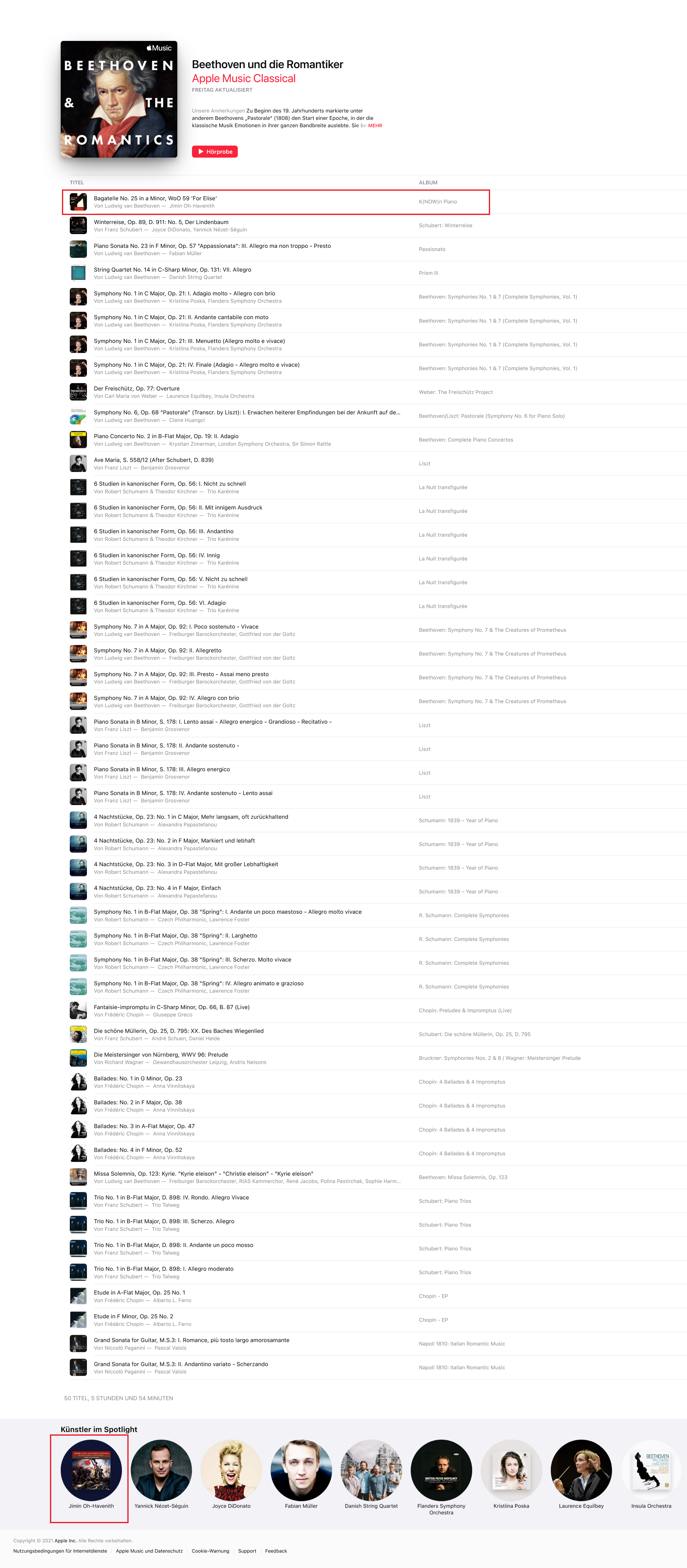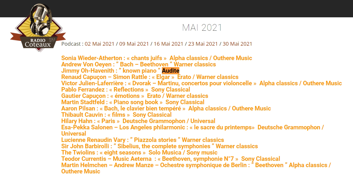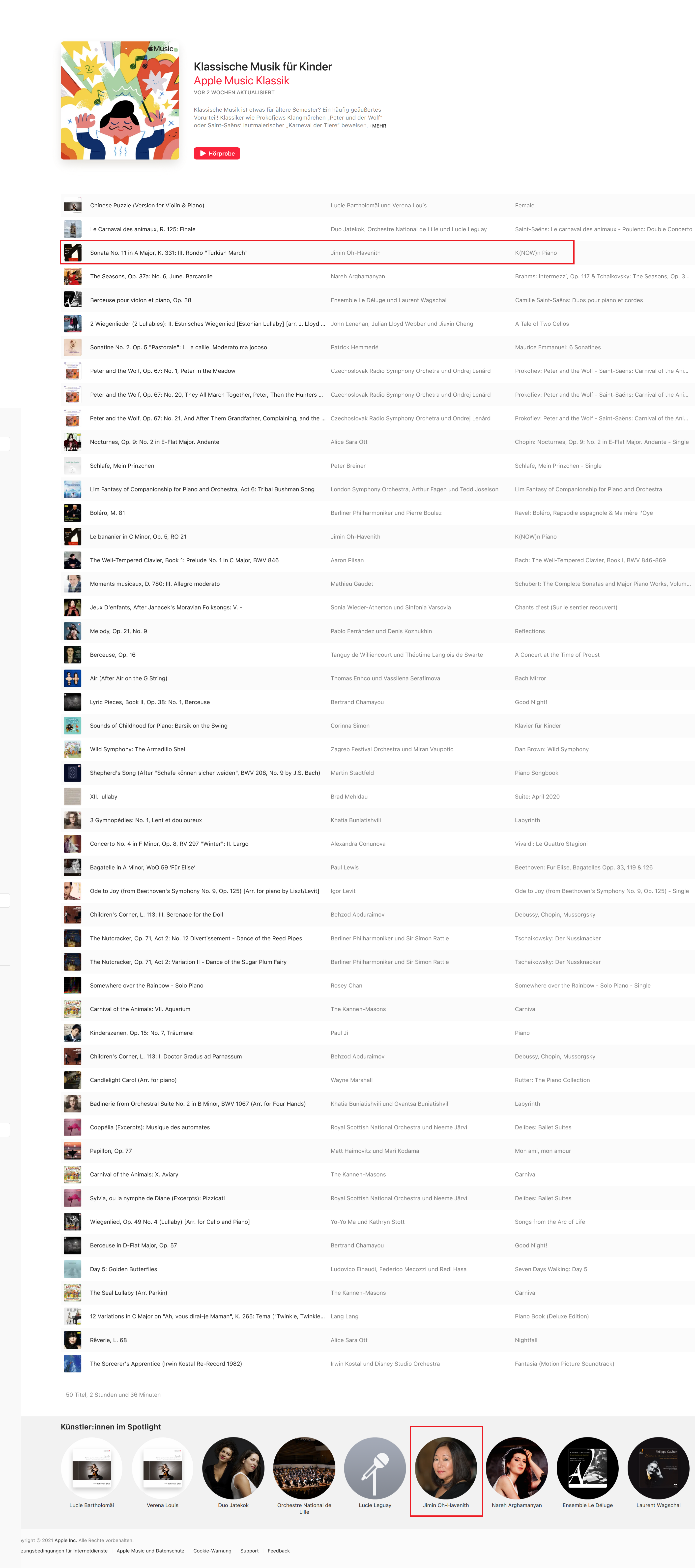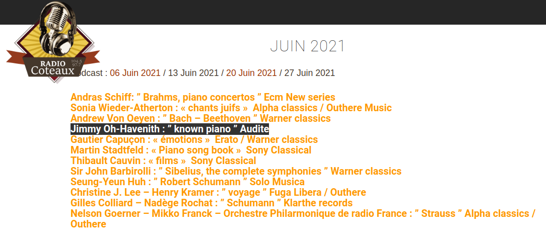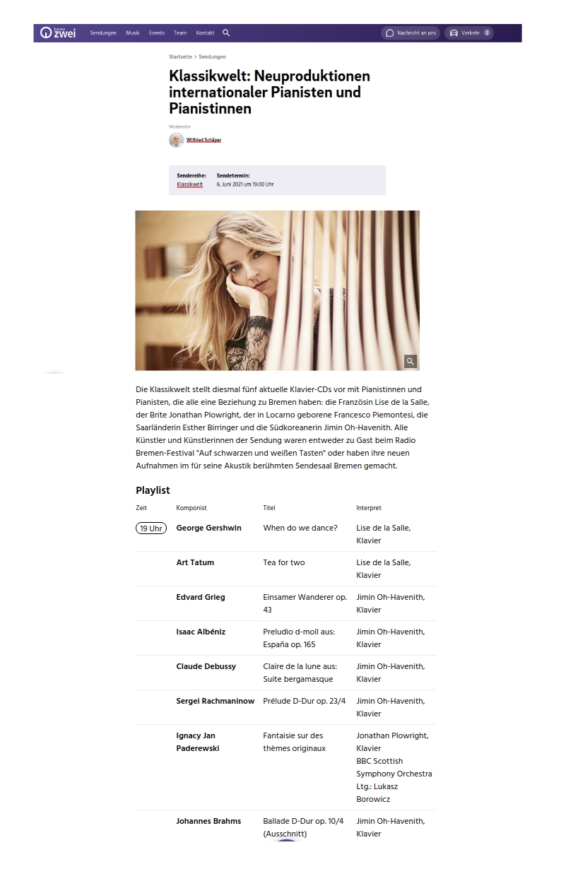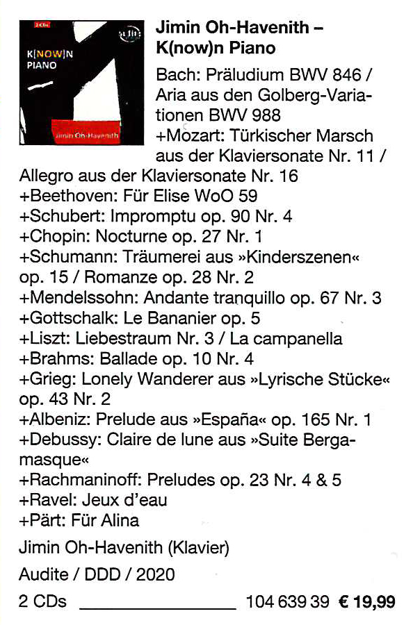21 popular piano pieces are performed by Jimin Oh-Havenith on her latest album on audite, including Mozart’s Turkish March, Beethoven’s Für Elise, Schubert’s Impromptu op. 90/4, Chopin’s Nocturne op. 27/1, Gottschalk’s Le Bananier op. 5, Liebestraum No. 3 and La campanella by Liszt, Debussy’s Claire de lune and Pärt’s Für Alina. A feel-good program played at a high technical level, with refinement and always sophisticated, more so, to really listen to.