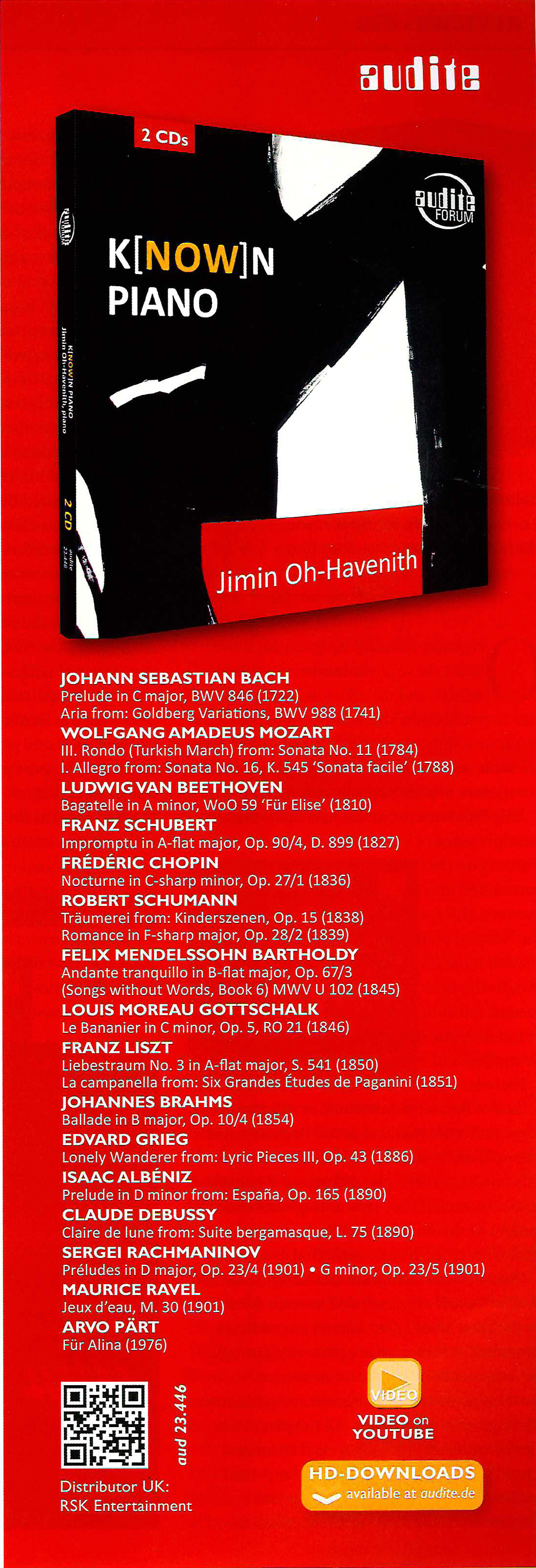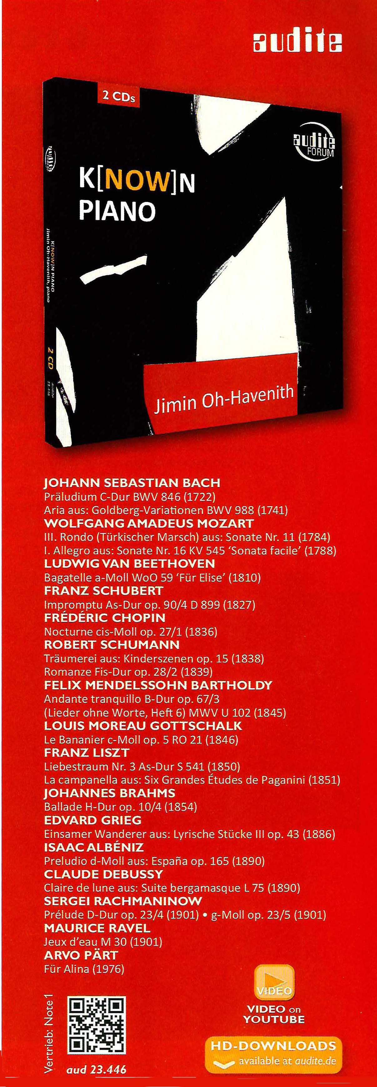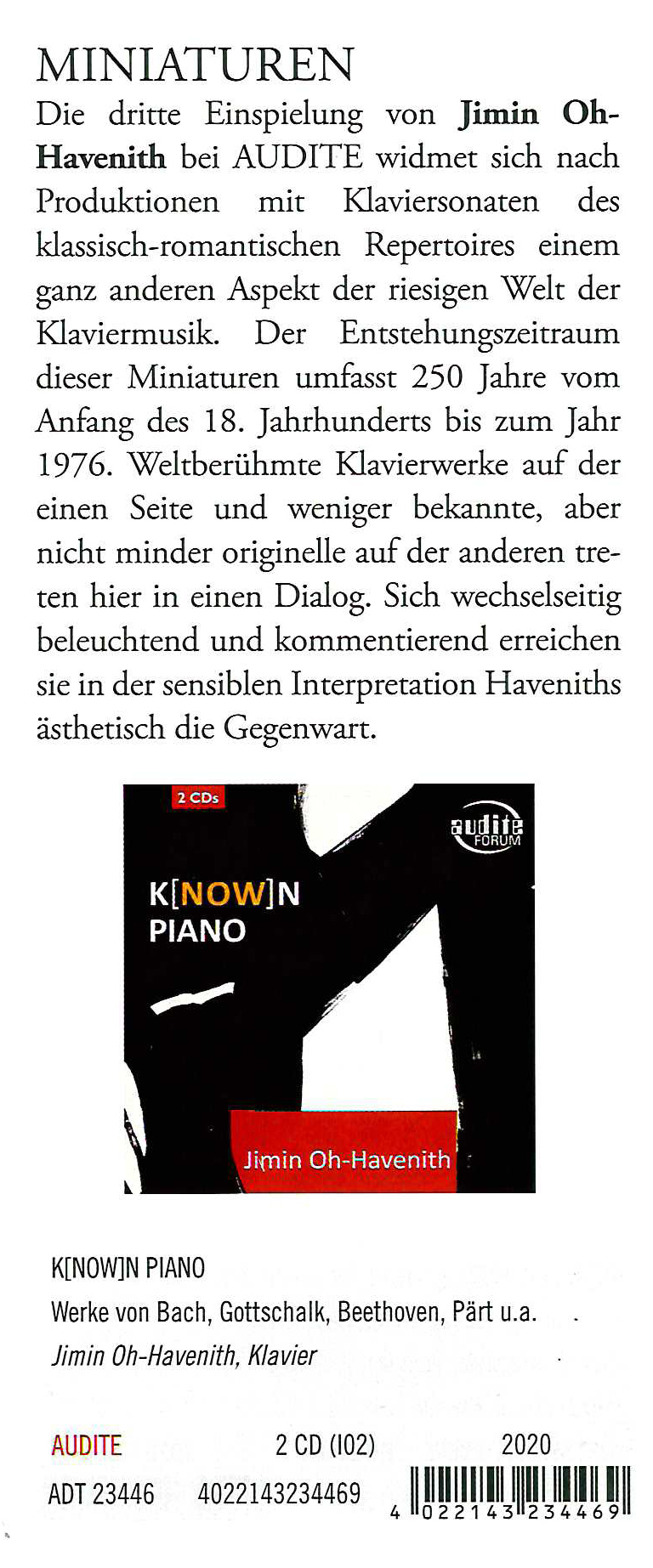 Jimin Oh-Havenith's third CD album for audite - following her recordings of great classical and romantic piano sonatas (Schubert, Liszt / Beethoven) - is dedicated to a completely different aspect in the immense world of piano music: different formats, such as a theme for variations, single sonata movements, the etude, the character piece and the free piece. These works span 250 years, from the early eighteenth century until 1976, comprising the baroque, classical, romantic, modern and post-modern styles. Pieces familiar to every piano student, such as Bach's C major Prelude from the Well-Tempered Clavier, the Turkish March from Mozart's Piano Sonata in A major, K. 331, and Beethoven's Für Elise, are contrasted with virtuoso works such as Liszt's Etude La campanella, Ravel's Jeux d'eau and - with a nod towards the New World - Louis Moreau Gottschalk's Le bananier. There is, of course, a programmatic structure connecting these 21 pieces to one another, hinted at by the title of the album, known / now: well-known and world-famous pieces on the one hand, and more obscure, though no less original, works on the other, creating a dialogue. Illuminating and informing each other, they gain aesthetic presence in Jimin Oh-Havenith's sensitive interpretations.