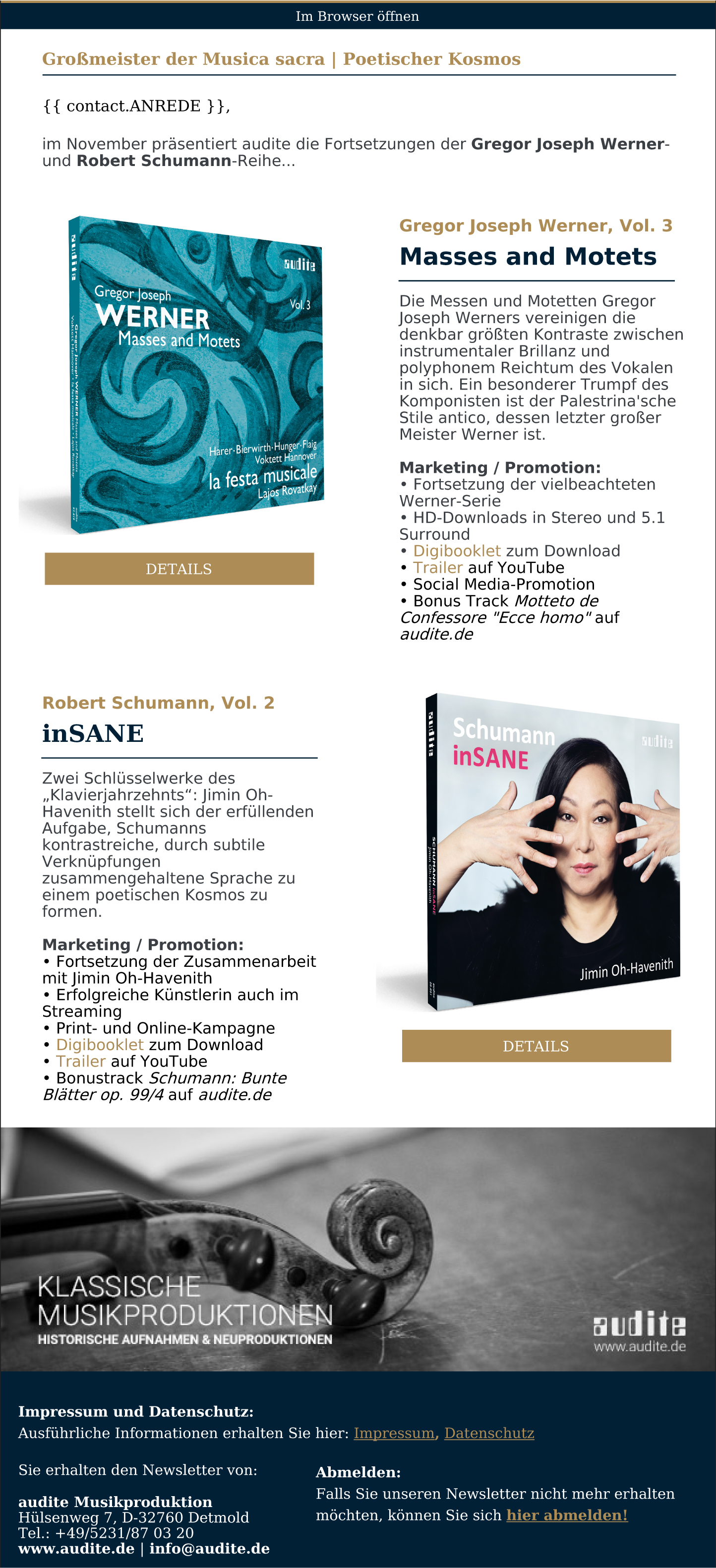 The “Kreisleriana”, for which Schumann was inspired by the whimsical character of E.T.A. Hoffmann’s Kapellmeister Kreisler and which also depicts himself and his Clara, opens this program by pianist Jimin Oh-Havenith at audite. She contrasts Schumann’s Opus 16 between virtuosic playfulness and the utmost tenderness in its two-pronged approach. However, the interpreter does not make a psychoanalytical study out of it; she exaggerates the drama just as little as the poetry. Thus, the core of the composition remains intact.