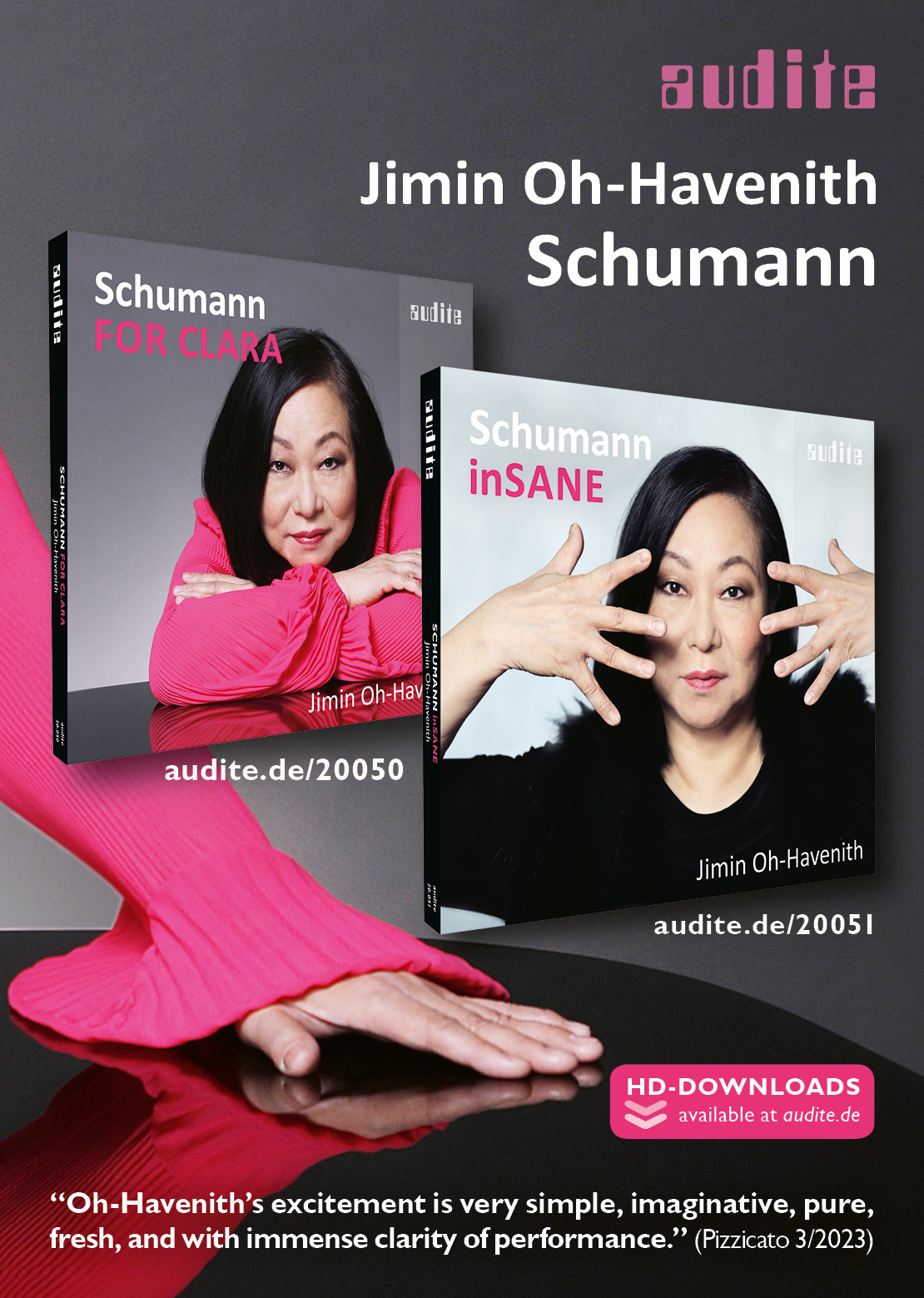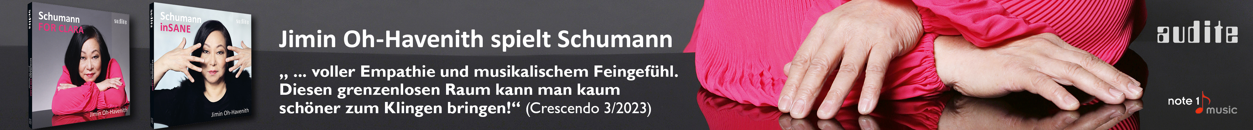 die Pianistin schlägt einen ganz großen Bogen von der ersten bis zur letzten Note. [...] Diese große Geschlossenheit erreicht Pianistin Jimin Oh-Havenith auch durch die hohe Präzision ihres Anschlags. [...] Was mich auch hier wieder an ihrem Spiel fasziniert ist die scheinbar unerschöpfliche Energie und Leidenschaft, mit der sie musiziert. Und sie hat sich auch hier wieder tief in das Seelenleben und Schumanns Welt mit allen ihren fiktiven wie realen Figuren hineingearbeitet, -gedacht und -gefühlt. Zwei intensive und fesselnde Schumann-Alben sind dabei herausgekommenMehr lesen