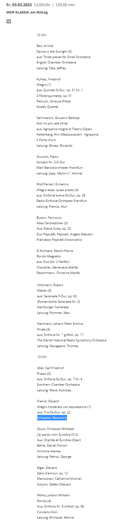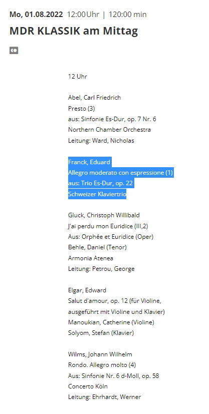 Eduard Franck Trio for piano, violin and cello in E-flat Major, Op. 22 (27:55) Schweizer Klaviertrio – Swiss Piano Trio