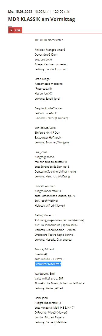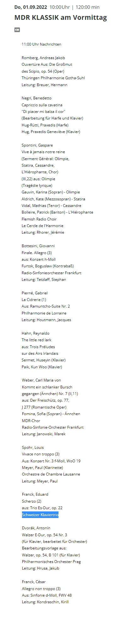 [...] Insgesamt ist diese CD ein Erlebnis und das Klaviertrio aus der Schweiz zeigt wieder einmal seine Klasse.