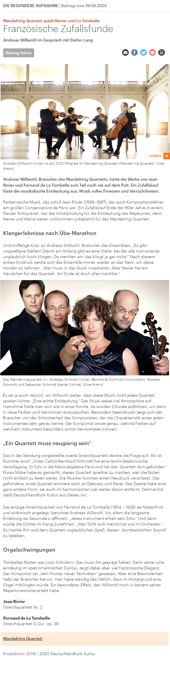 Crescendo Magazine | Le 12 juin 2021 | Jean Lacroix | June 12, 2021 | source: https://www.cres... Le Quatuor Mandelring freine l’émotion chez Ravel et de La Tombelle