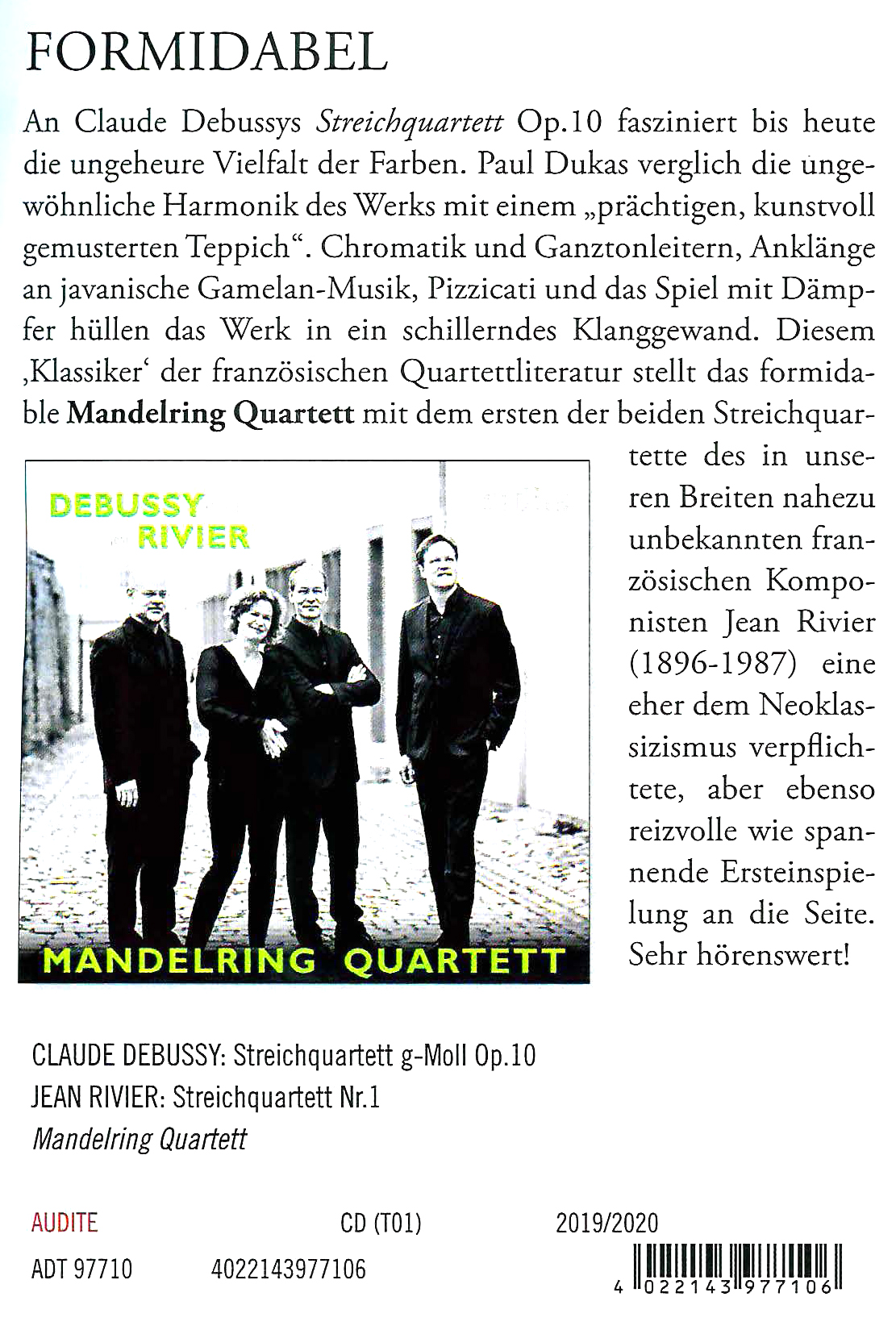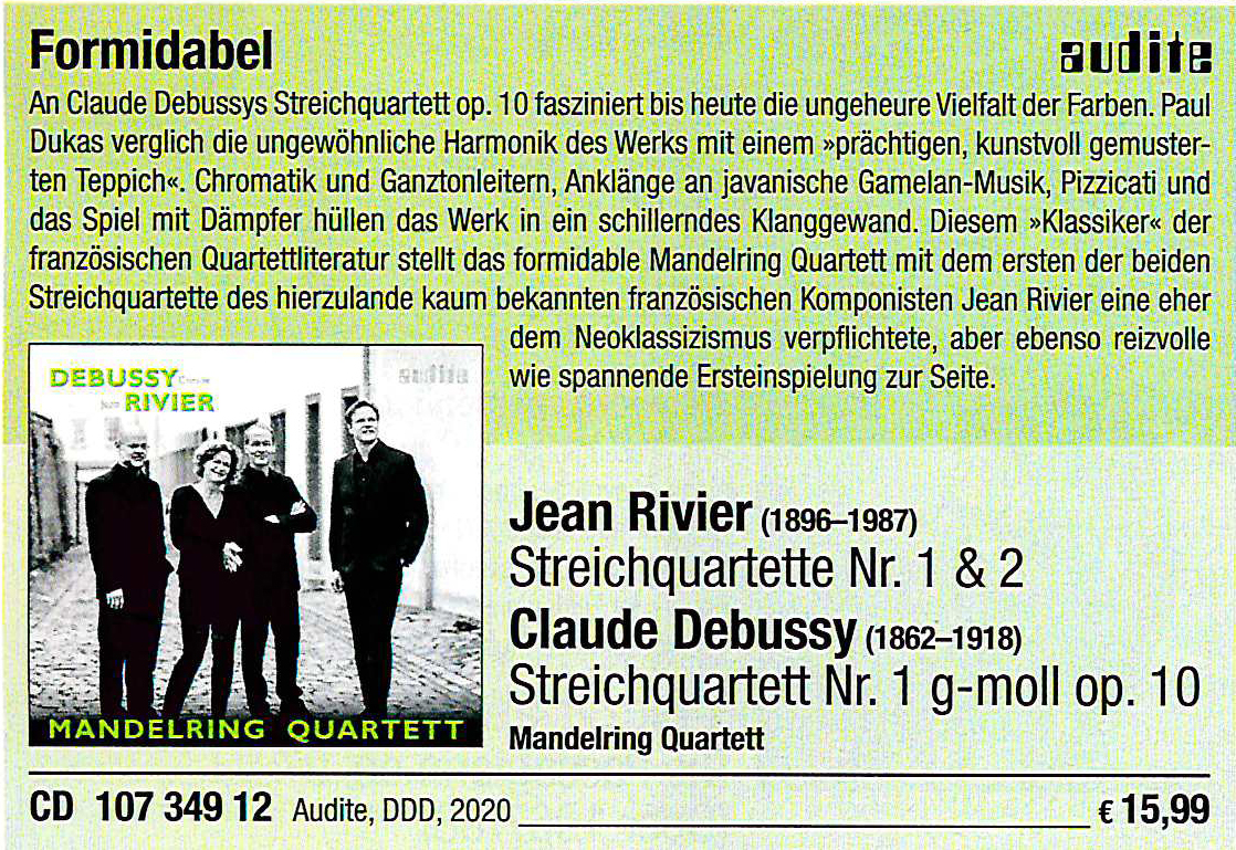 Das Mandelring Quartett widmet auch diesen Werken sowohl größte Intensität als auch aus dem Momentum erwachsende Lebendigkeit, so dass eine unmittelbar wirkende Ausstrahlung vermittelt wird. Damit schaffen sie es nicht nur, das sprödere Wesen des zweiten Quartetts von Rivier gegenüber seinem ersten heraus zu kristallisieren, das sich in vielen Details wie großen Intervallen, extremen Laustärkeunterschieden und reibenden Dissonanzen äußert, sondern bieten gleichzeitig auch eine wiederum auf Debussy angepasste Lesart zum Klingen zu bringen.