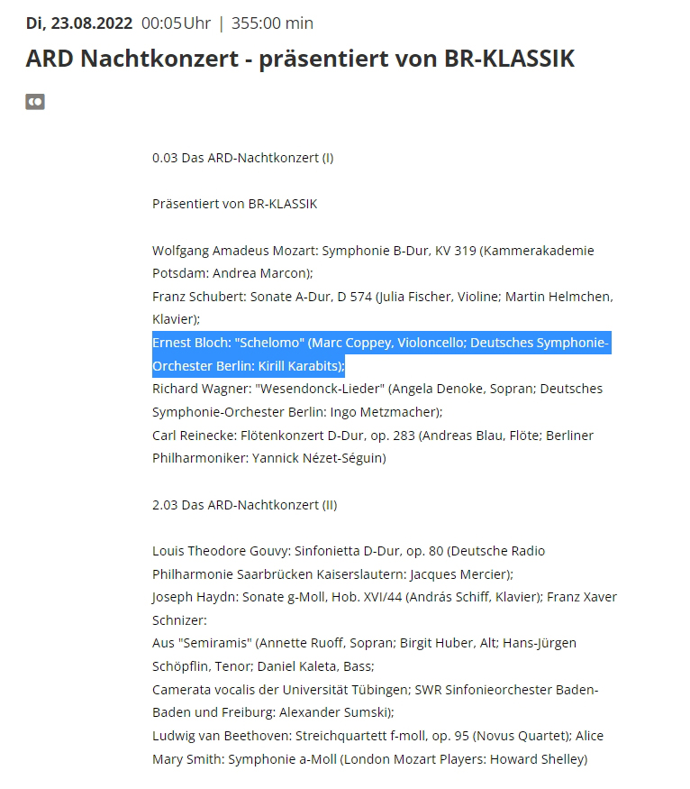 Mit dem Deutschen Symphonieorchester Berlin hat Marc Coppey einen nicht minder ausdrucksstarken Partner zur Seite. In Blochs ‘Schelomo’ treibt Kirill Karabits sein Orchester zu einem kraft- und spannungsvollen Spiel an – ein herrlicher Gegenpart zu den Monologen, den intimen Gedanken des Cellos.