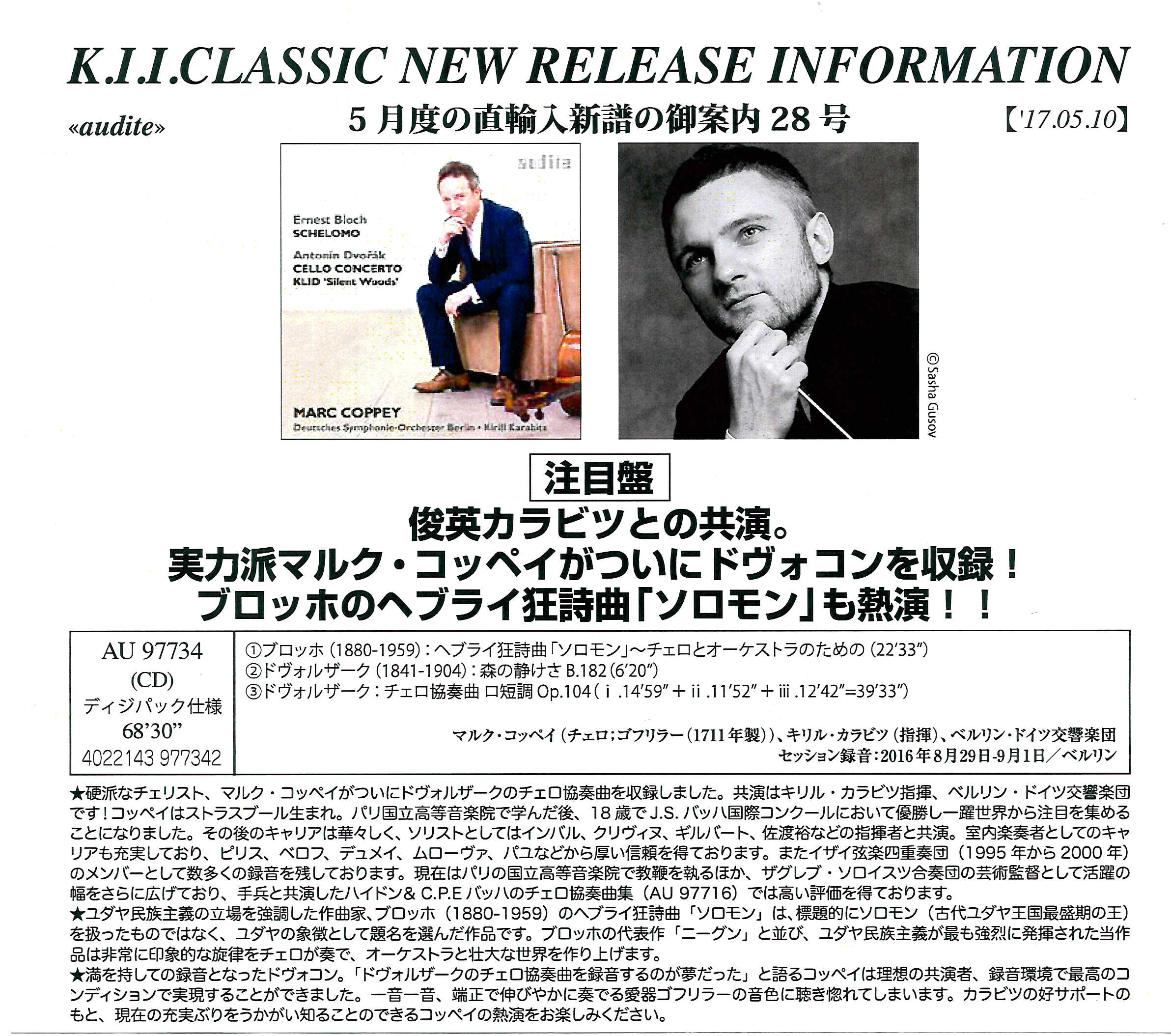 Marc Coppey’s performances of Bloch’s Schelomo and Dvorak’s Cello Concerto are absolutely striking, both technically and expressively. Conducted by the very inspired Kirill Karabits, the Deutsches Symphonie-Orchester Berlin is an excellent partner for the French cellist.