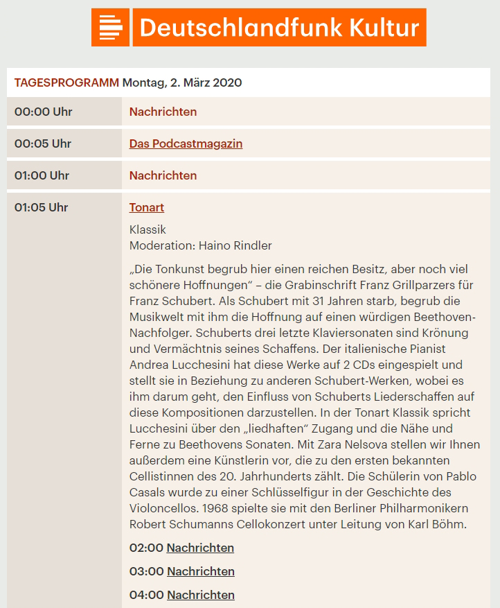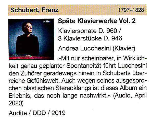 „Lucchesinis Schubert-Spiel ist von einer fast altmeisterlichen Gelassenheit und steht mit seiner nobel untertreibenden Gestaltungskraft ziemlich einsam da.“