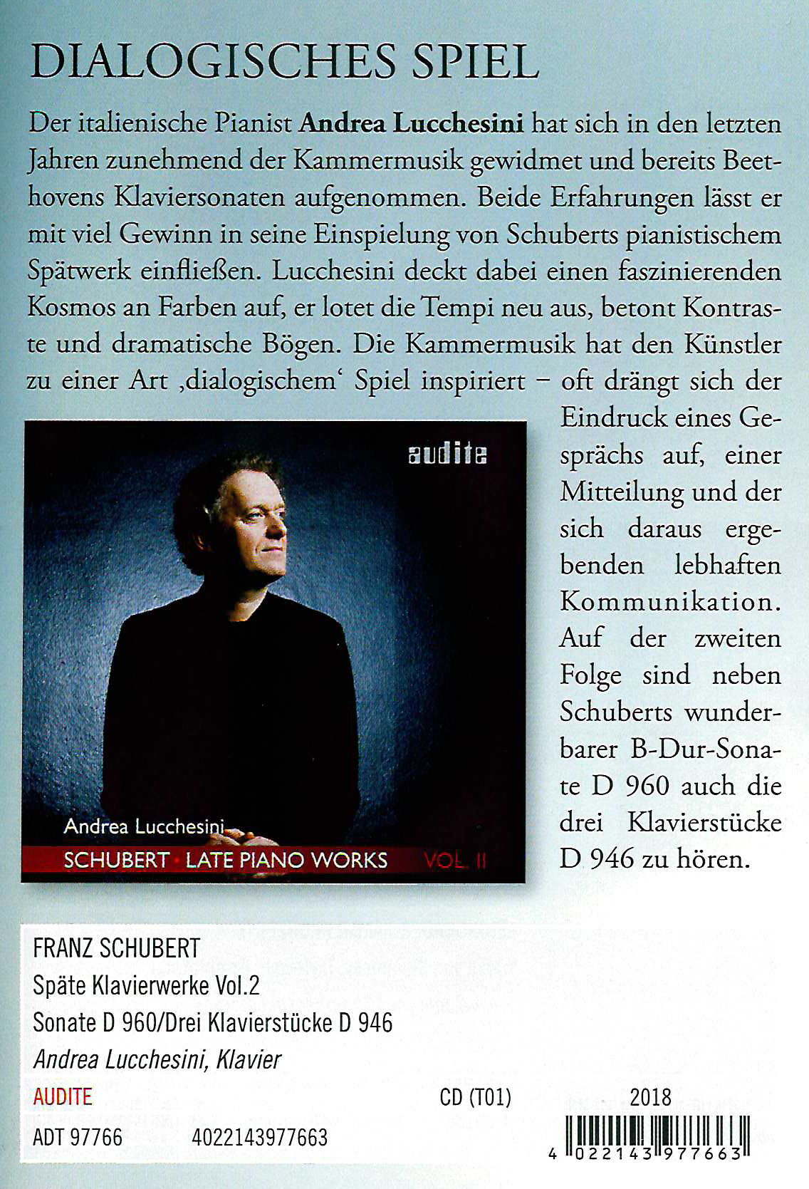 Following the first instalment of his three-part Schubert series, the Florentine pianist Andrea Lucchesini now approaches the sanctum of Schubert's keyboard music: the Piano Sonata in B-flat major D. 960, composed a few weeks before the composer's untimely death in November 1828.