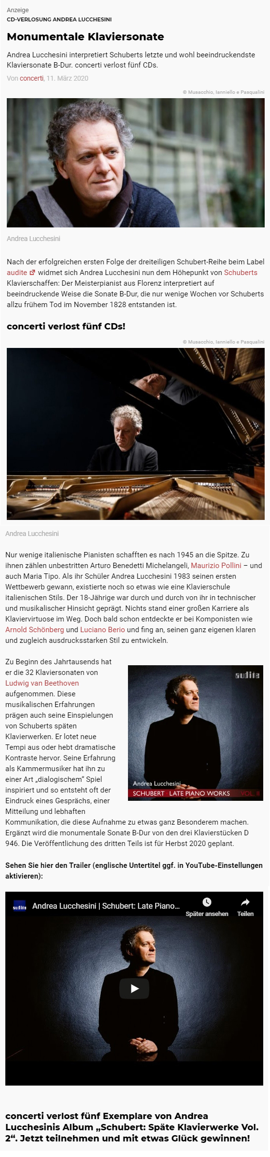www.pizzicato.lu | 06/03/2020 | Remy Franck | March 6, 2020 | source: https://www.pizz... Lucchesinis Schubert: breite Ausdrucksvielfalt