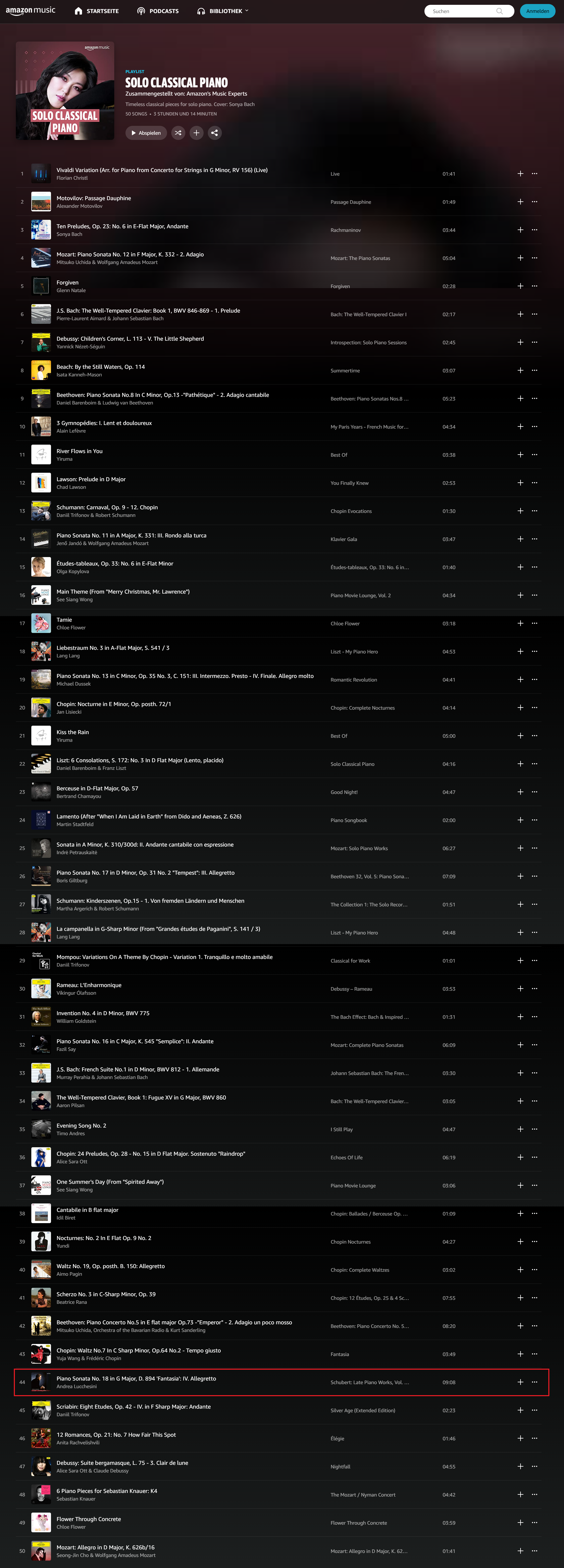 Lucchesini macht eben nicht den Fehler, in reines Schwelgen auszubrechen. Die nicht genannten Worte, die hinter der Musik liegen und sie unter seinen Händen tatsächlich zu so etwas wie "Liedern ohne Worte" machen, stehen dem wohl entgegen. So passt es auch, dass der Pianist vieles in einer Art Balladenton präsentiert [...] und seinen Schubert "erzählt". Hinzu kommt Lucchesinis geradezu wunderbare Entdeckung eines ganz eigenen Schubert-Klanges, mit dem er die G-Dur-Sonate schon eröffnet, um dann mit diesem Mittel echte Wunder zu vollbringenMehr lesen