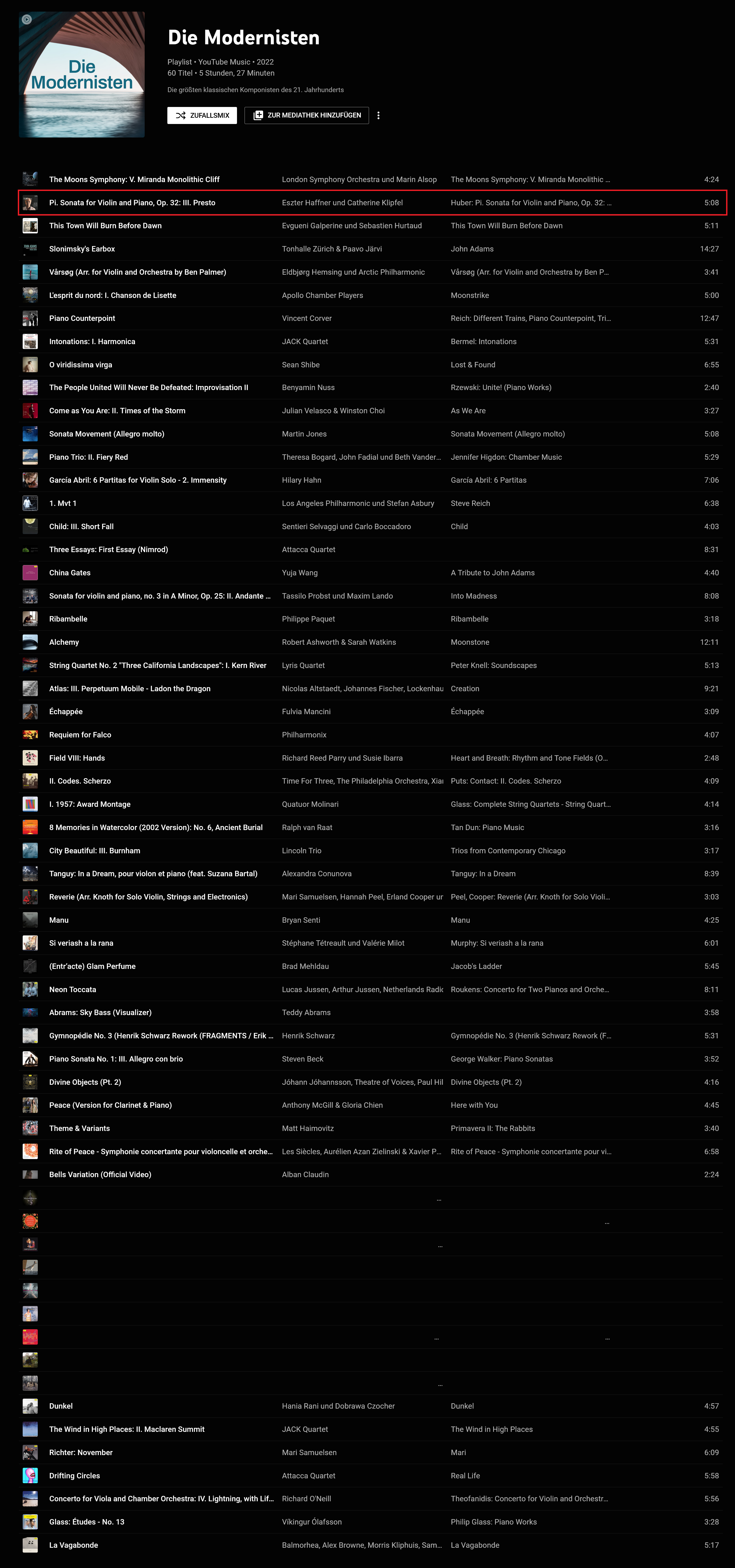 Die beiden Sonaten gehen in ihrer Gestaltung eher normale Wege. Die Geigerin Eszter Haffner mag dabei als Huber-Spezialistin sehen, da sie auch schon andere Werke des Komponisten aufgeführt und eingespielt hat. Ihr Spiel zeichnet mit geigerischer Souveränität und Gestaltungsfeinsinn die Violinstimme und bietet zusammen mit der Pianistin eine sichere Interpretation der Violinsonate. Catherine Klipfel am Klavier weiß wie in allen Werken mit ihrem gestalteten Tastenspiel eine profunde und sichere Grundlage für die jeweiligen anderen Beteiligten zu geben, auf der sie mit diesen das gemeinsame Agieren gestaltet.