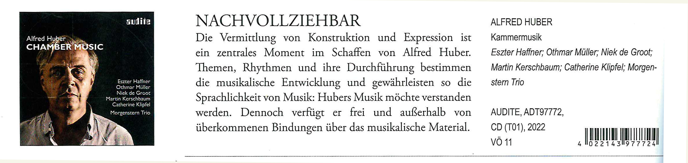 Communicating construction and expression is a central aspect in Alfred Huber's musical oeuvre. Themes, rhythms and their execution determine the musical development, ensuring the music's linguistic quality. Alfred Huber's music is composed with an addressee in mind: it wants to be understood and comprehended. Nevertheless, the composer uses his musical material freely and away from any traditional ties, consistently coming up with new solutions for creating musical orders and systems. In works such as Phi, Op. 27, or Pi, Op. 32, he extracts formats and proportions from numbers and numerical series. In Impossibile, Op. 20, poetic models inform his composition, while in the Piano Trio, Op. 35, he utilises an almost classical approach in his thematic development - a tribute to Ludwig van Beethoven, "the hero of my youth" (Alfred Huber) .