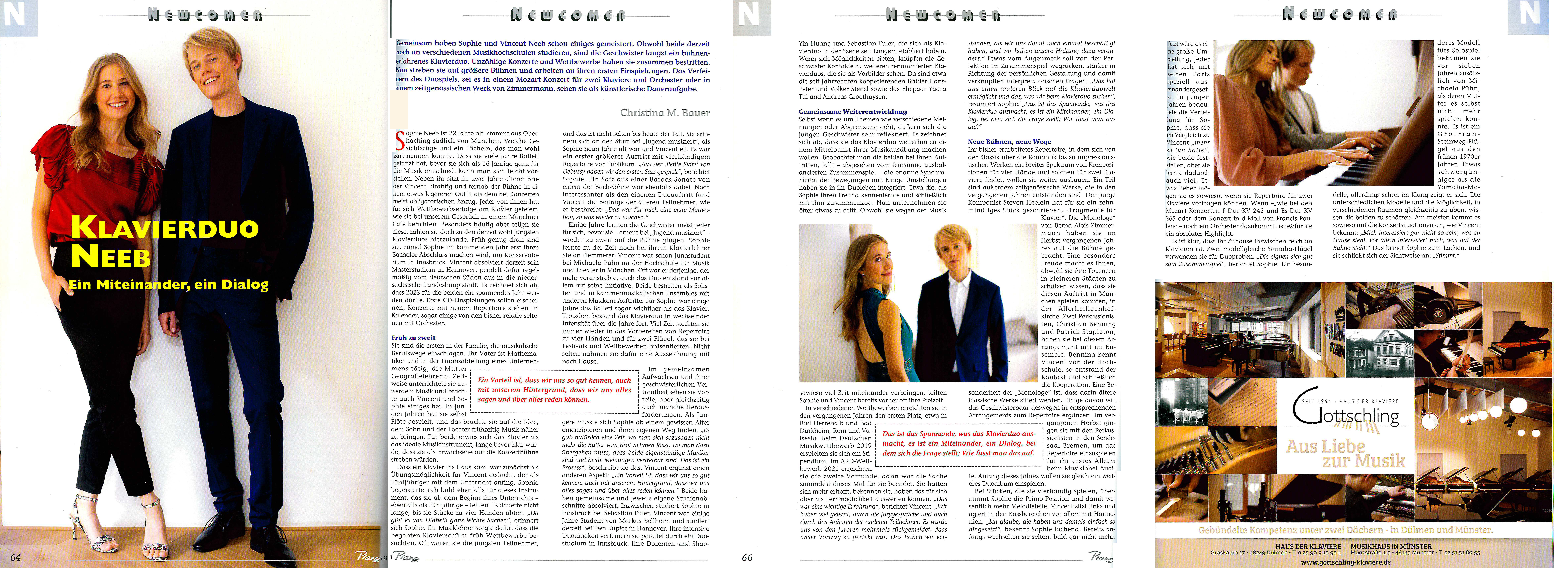 Sophie (geb. 2000) und Vincent Neeb (geb. 1998) sind Geschwister. Schon in frühen Jugendjahren haben sie das gemeinsame Musizieren am Klavier für sich entdeckt. Eine Entdeckung, die auch der Außenwelt nicht verborgen blieb: zahlreiche Wettbewerbspreise und Stipendien wurde dem Klavierduo seither zuteil. Beim Label audite veröffentlicht das Duo nun gleich zwei Alben innerhalb kurzer Zeit.