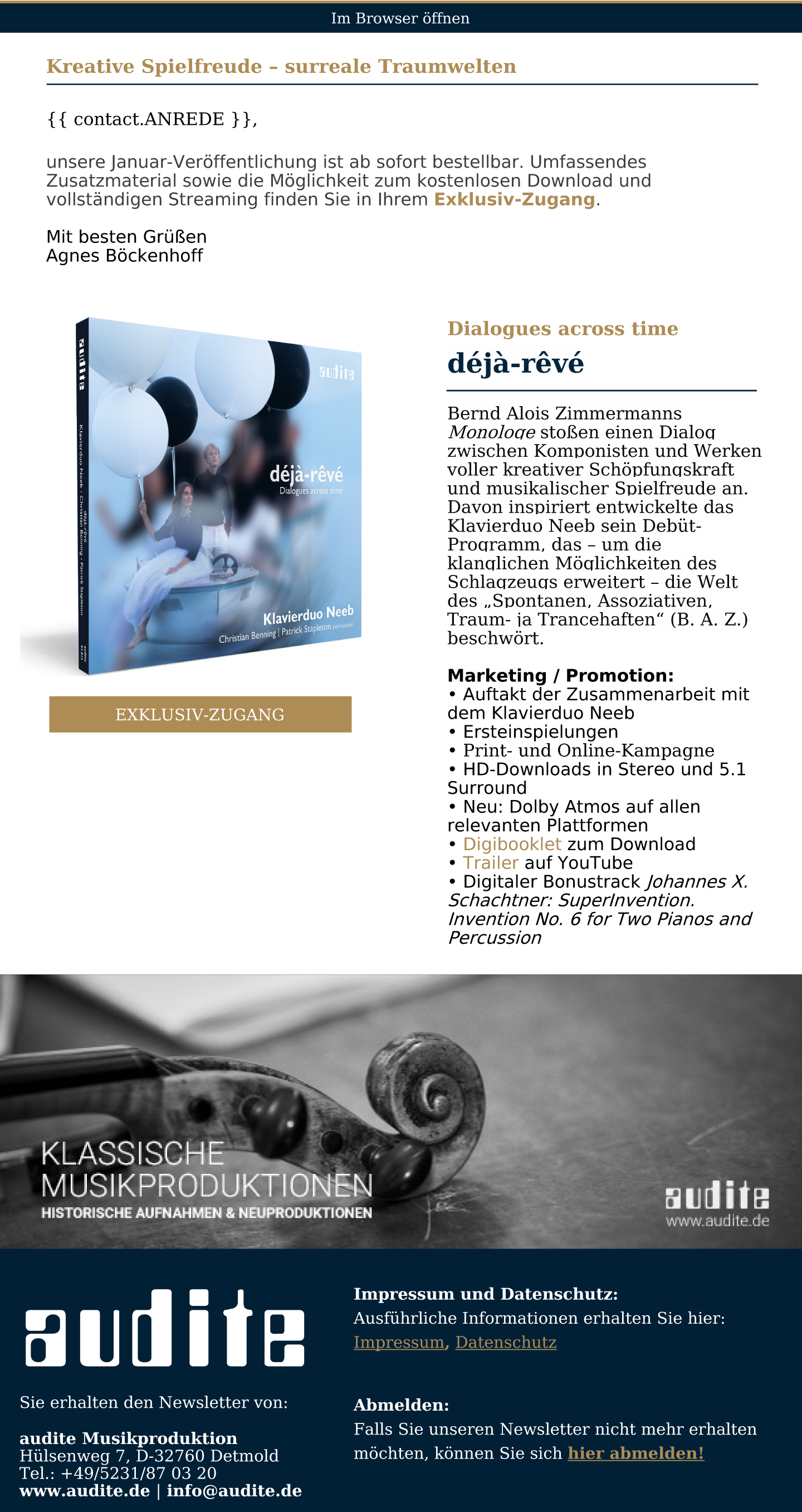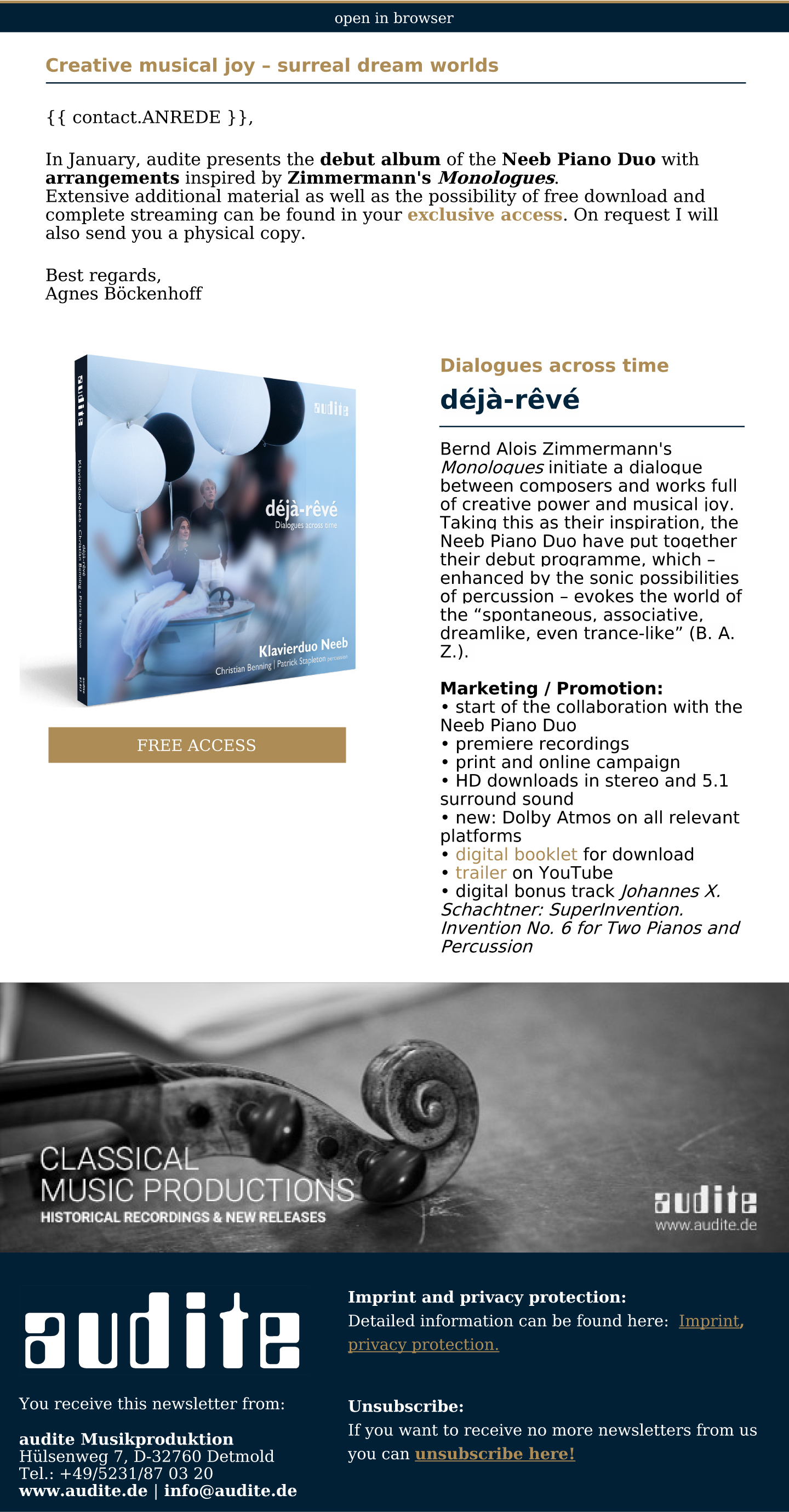 Das Debütalbum "déjà-rêvé" trägt den Untertitel "Dialoge über die Zeiten hinweg" - damit hatte der deutsche Komponist Bernd Alois Zimmermann einst sein Werk "Monologe für zwei Klaviere" beschrieben, in dem er historische Kompositionen einfließen lässt und zitiert. Das Stück bildet den Ausgangspunkt des Albums, auf dem das Klavierduo Neeb diesen Dialog-Gedanken gemeinsam mit zwei Gast-Perkussionisten auf kreative Art weiterspinnt.